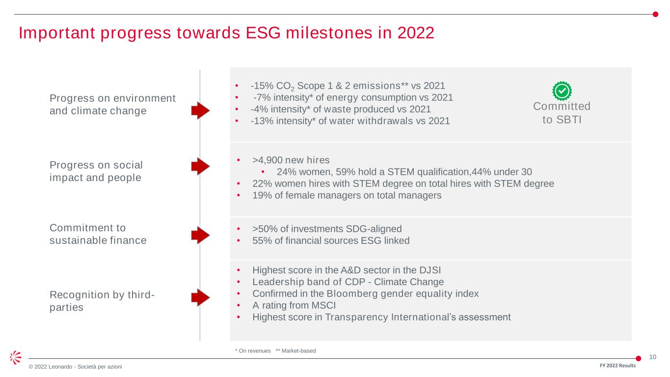 9 © 2022 Leonardo - Società per azioni Interoperability and strategic presence across all domains Strategic presence as leader across Helicopters, Simulation & Training and EU Defence Electronics Key player in European Cooperation Programmes, Safety and Security partner for Institutions Synergies in R&D and product innovation capabilities Challenging traditional business models with digitalisation capabilities Strong and unique portfolio to address multidomain solutions DIGITALIZATION PROCESSES TECHNOLOGIES DISTRIBUTED INTELLIGENCE SENSOR SUITE GLOBAL MONITORING CYBER PLATFORMS FIXED WING ROTARY WING ADVANCED AIR MOBILITY INTELLIGENT AUTONOMOUS SYSTEMS M U L T ID O M A IN & I N T E R O P E R A B IL IT Y DATA C4I Driver of innovation and development in a digital and sustainable way FY 2022 Results