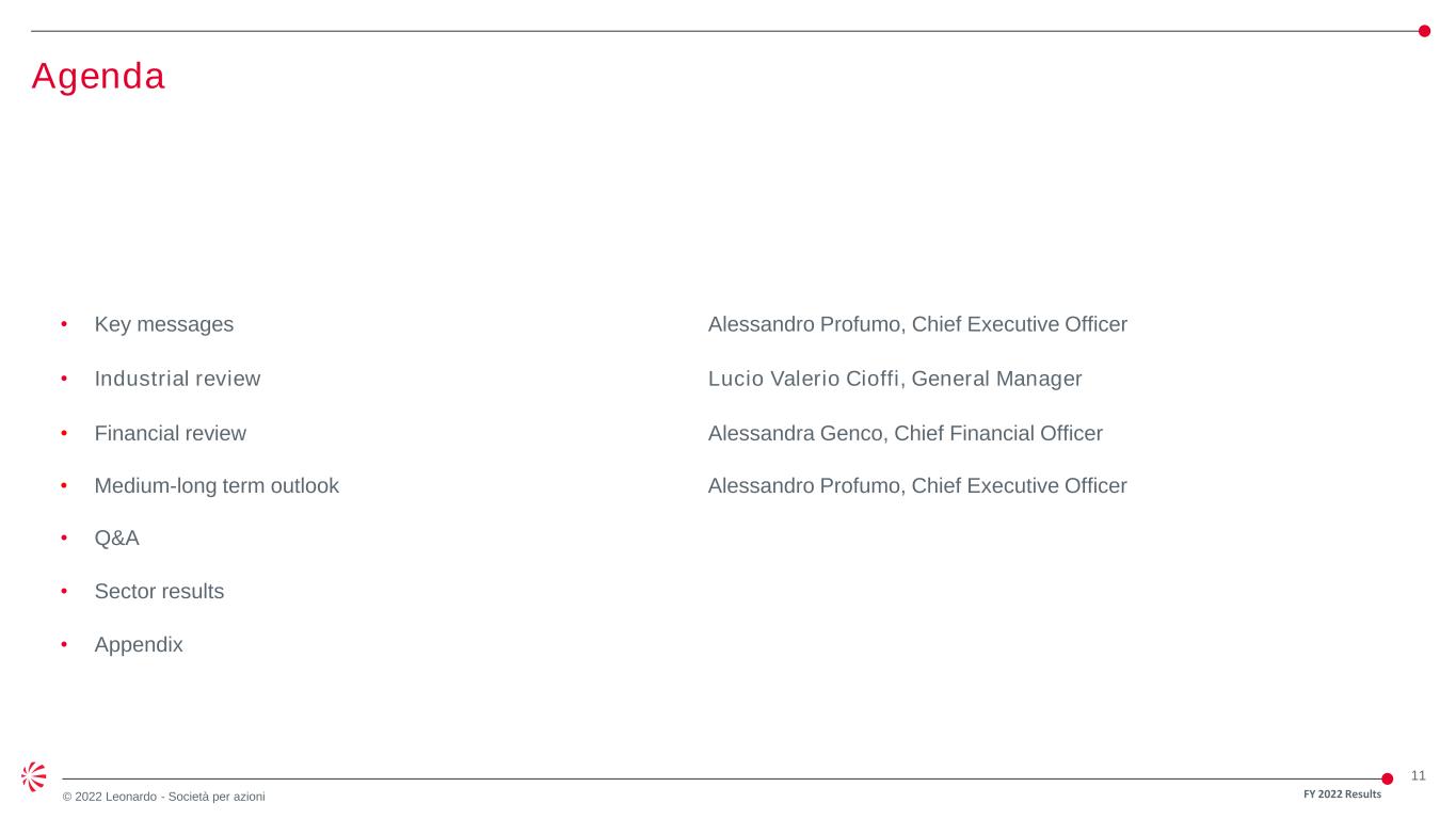 10 © 2022 Leonardo - Società per azioni Committed to SBTI Important progress towards ESG milestones in 2022 • >50% of investments SDG-aligned • 55% of financial sources ESG linked • -15% CO2 Scope 1 & 2 emissions** vs 2021 • -7% intensity* of energy consumption vs 2021 • -4% intensity* of waste produced vs 2021 • -13% intensity* of water withdrawals vs 2021 • >4,900 new hires • 24% women, 59% hold a STEM qualification,44% under 30 • 22% women hires with STEM degree on total hires with STEM degree • 19% of female managers on total managers Progress on environment and climate change Progress on social impact and people Commitment to sustainable finance Recognition by third- parties • Highest score in the A&D sector in the DJSI • Leadership band of CDP - Climate Change • Confirmed in the Bloomberg gender equality index • A rating from MSCI • Highest score in Transparency International’s assessment FY 2022 Results * On revenues ** Market-based