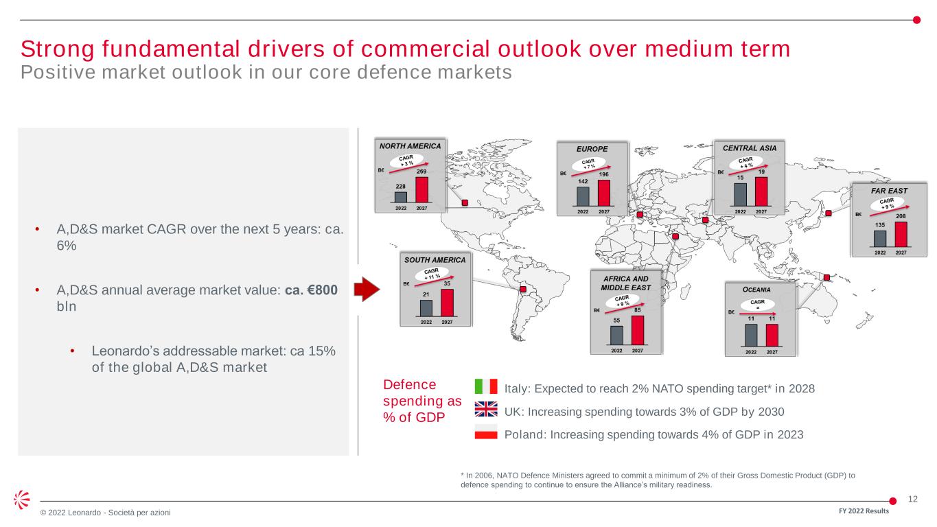 11 © 2022 Leonardo - Società per azioni Agenda FY 2022 Results • Key messages • Industrial review • Financial review • Q&A • Sector results • Appendix Alessandro Profumo, Chief Executive Officer Lucio Valerio Cioffi, General Manager Alessandra Genco, Chief Financial Officer • Medium-long term outlook Alessandro Profumo, Chief Executive Officer