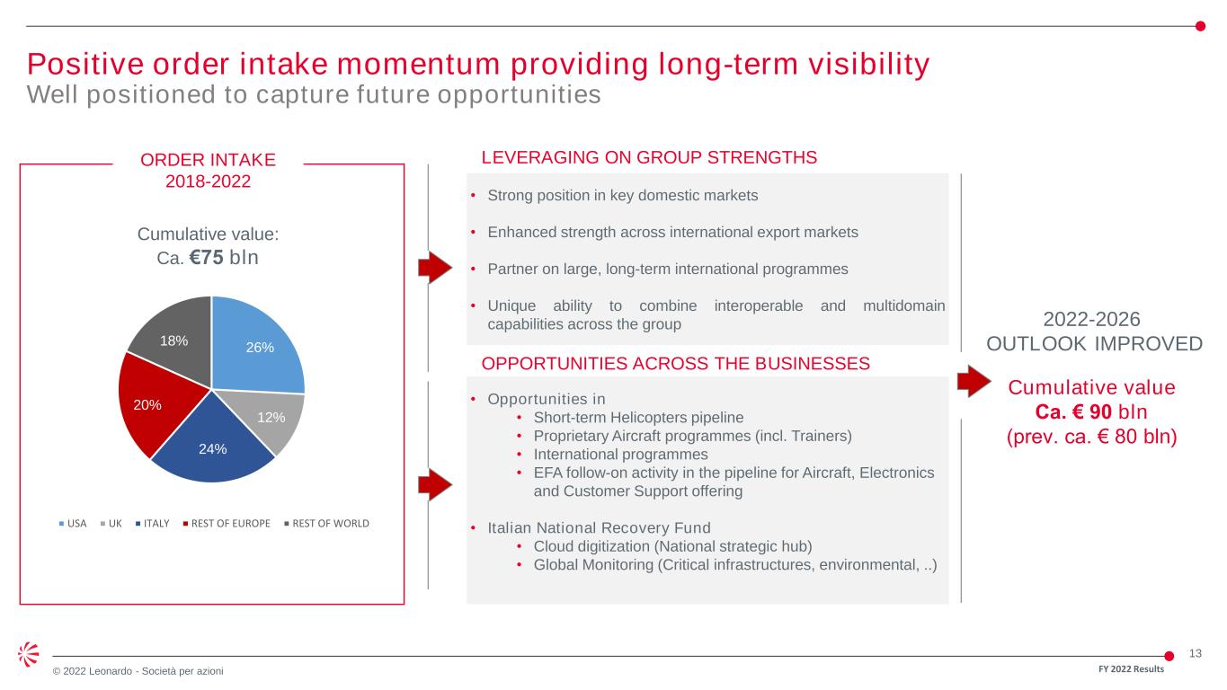 12 © 2022 Leonardo - Società per azioni FY 2022 Results Strong fundamental drivers of commercial outlook over medium term Positive market outlook in our core defence markets • A,D&S market CAGR over the next 5 years: ca. 6% • A,D&S annual average market value: ca. €800 bln • Leonardo’s addressable market: ca 15% of the global A,D&S market * In 2006, NATO Defence Ministers agreed to commit a minimum of 2% of their Gross Domestic Product (GDP) to defence spending to continue to ensure the Alliance’s military readiness. Poland: Increasing spending towards 4% of GDP in 2023 Italy: Expected to reach 2% NATO spending target* in 2028 UK: Increasing spending towards 3% of GDP by 2030 Defence spending as % of GDP
