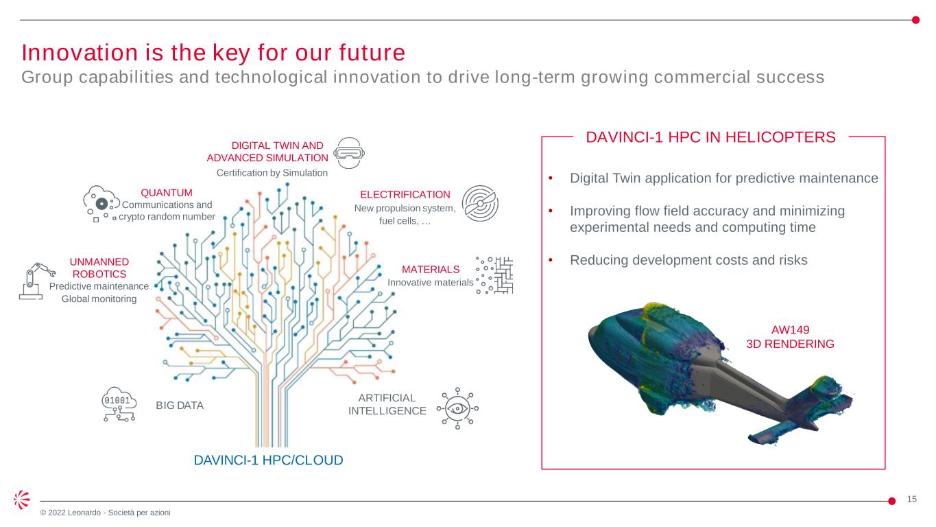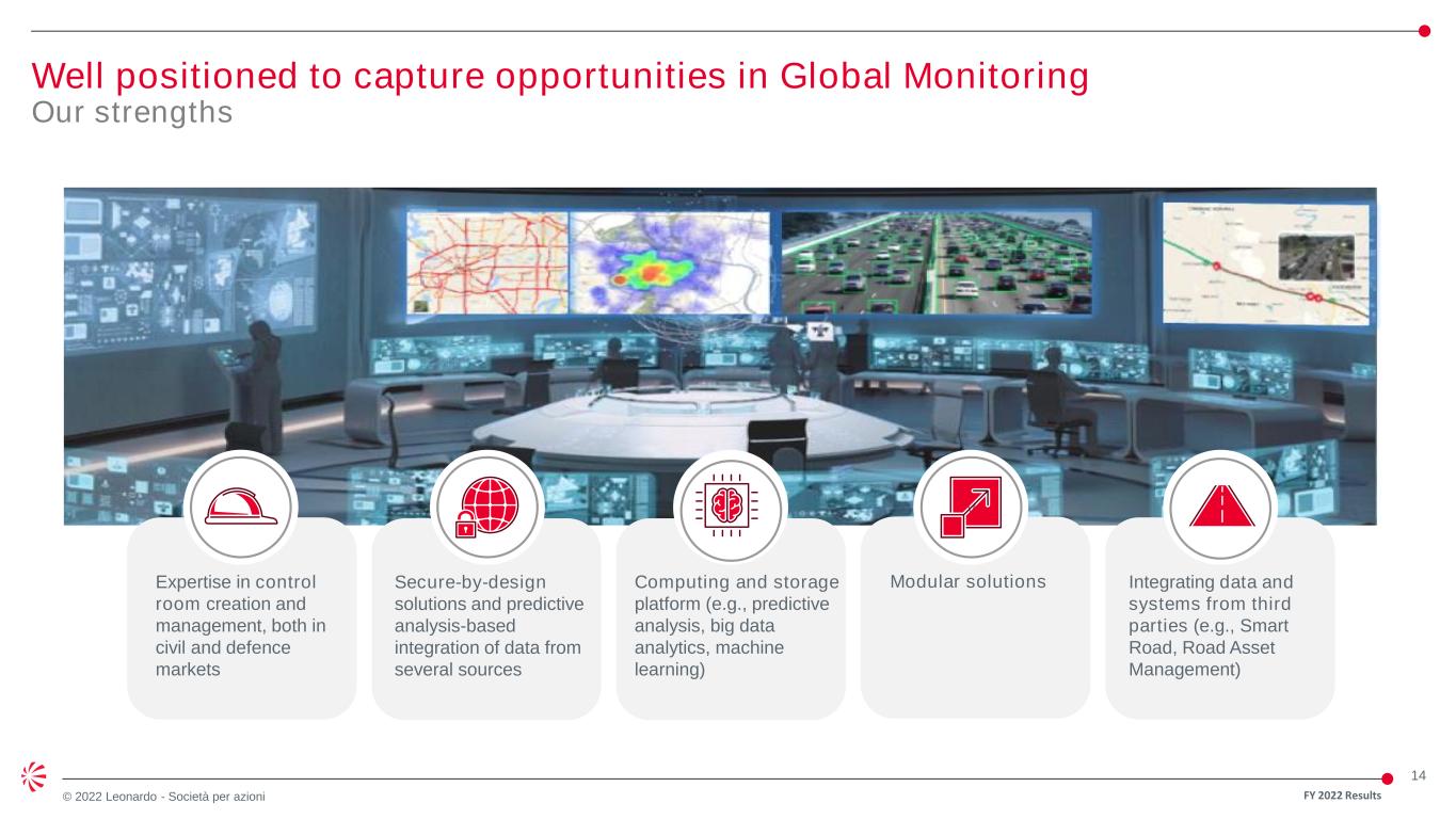 14 © 2022 Leonardo - Società per azioni Well positioned to capture opportunities in Global Monitoring Our strengths FY 2022 Results v Secure-by-design solutions and predictive analysis-based integration of data from several sources Computing and storage platform (e.g., predictive analysis, big data analytics, machine learning) Modular solutions Integrating data and systems from third parties (e.g., Smart Road, Road Asset Management) Expertise in control room creation and management, both in civil and defence markets