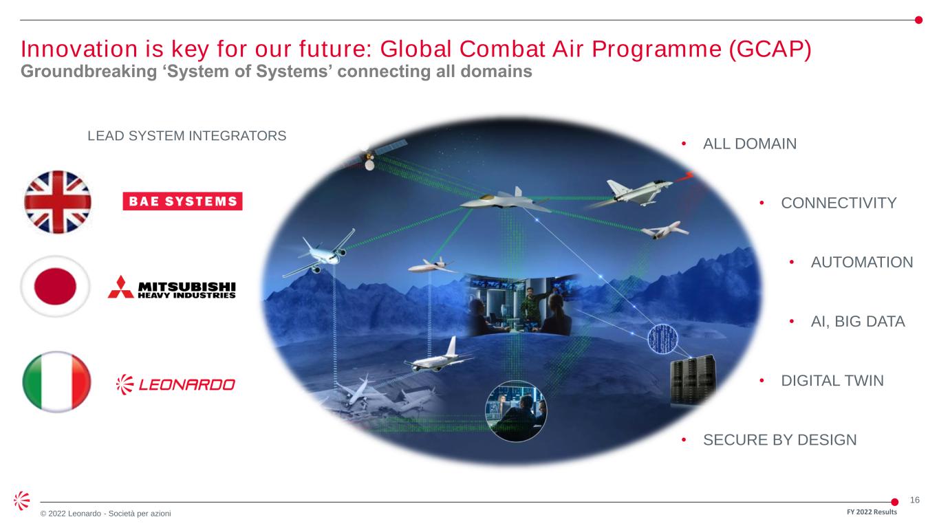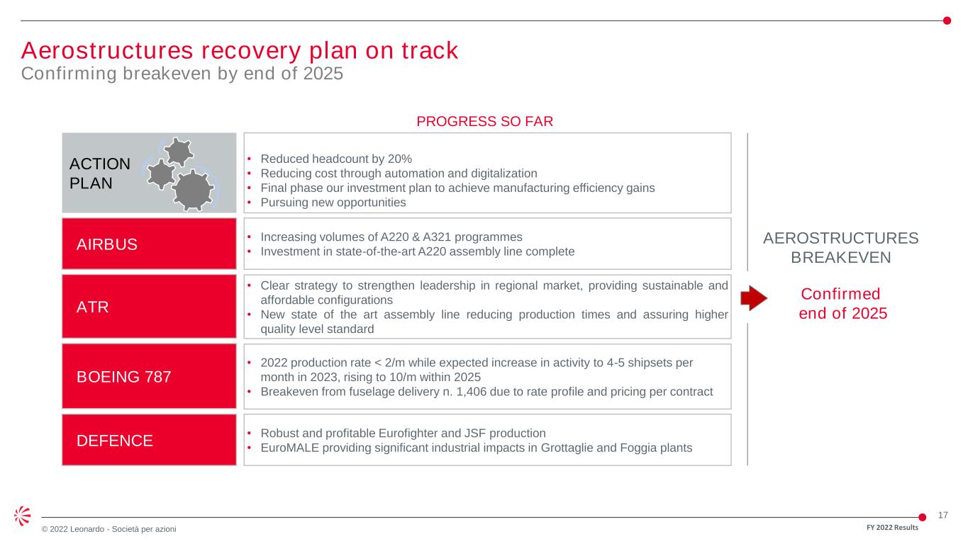 16 © 2022 Leonardo - Società per azioni Innovation is key for our future: Global Combat Air Programme (GCAP) Groundbreaking ‘System of Systems’ connecting all domains FY 2022 Results • ALL DOMAIN • CONNECTIVITY • AUTOMATION • AI, BIG DATA • SECURE BY DESIGN LEAD SYSTEM INTEGRATORS • DIGITAL TWIN