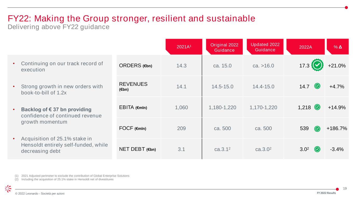 18 © 2022 Leonardo - Società per azioni Agenda FY 2022 Results • Key messages • Industrial review • Financial review • Q&A • Sector results • Appendix Alessandro Profumo, Chief Executive Officer Lucio Valerio Cioffi, General Manager Alessandra Genco, Chief Financial Officer • Medium-long term outlook Alessandro Profumo, Chief Executive Officer