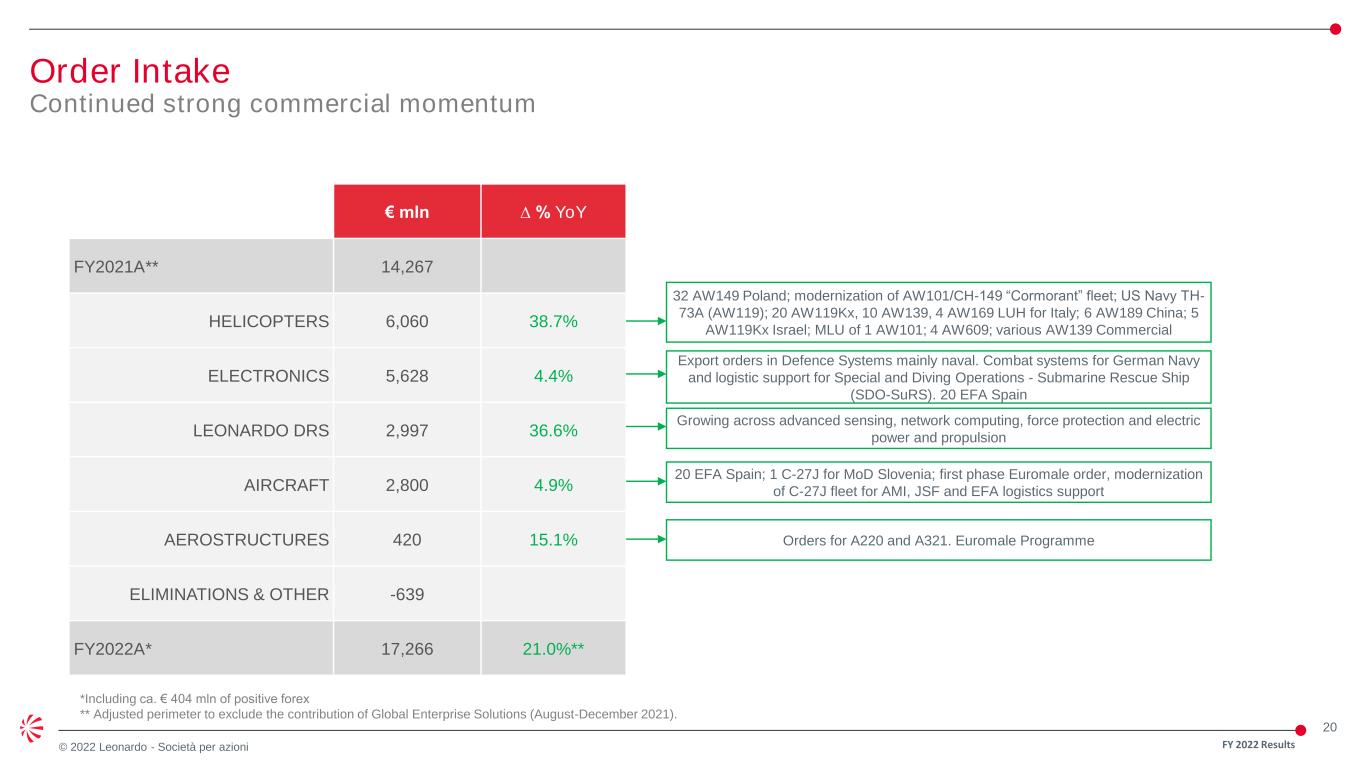 19 © 2022 Leonardo - Società per azioni FY22: Making the Group stronger, resilient and sustainable Delivering above FY22 guidance FY 2022 Results (1) 2021 Adjusted perimeter to exclude the contribution of Global Enterprise Solutions (2) Including the acquisition of 25.1% stake in Hensoldt net of divestitures 2021A1 Original 2022 Guidance Updated 2022 Guidance ORDERS (€bn) 14.3 ca. 15.0 ca. >16.0 17.3 +21.0% REVENUES (€bn) 14.1 14.5-15.0 14.4-15.0 14.7 +4.7% EBITA (€mln) 1,060 1,180-1,220 1,170-1,220 1,218 +14.9% FOCF (€mln) 209 ca. 500 ca. 500 539 +186.7% NET DEBT (€bn) 3.1 ca.3.12 ca.3.02 3.02 -3.4% 2022A • Continuing on our track record of execution • Strong growth in new orders with book-to-bill of 1.2x • Backlog of € 37 bn providing confidence of continued revenue growth momentum • Acquisition of 25.1% stake in Hensoldt entirely self-funded, while decreasing debt % Δ