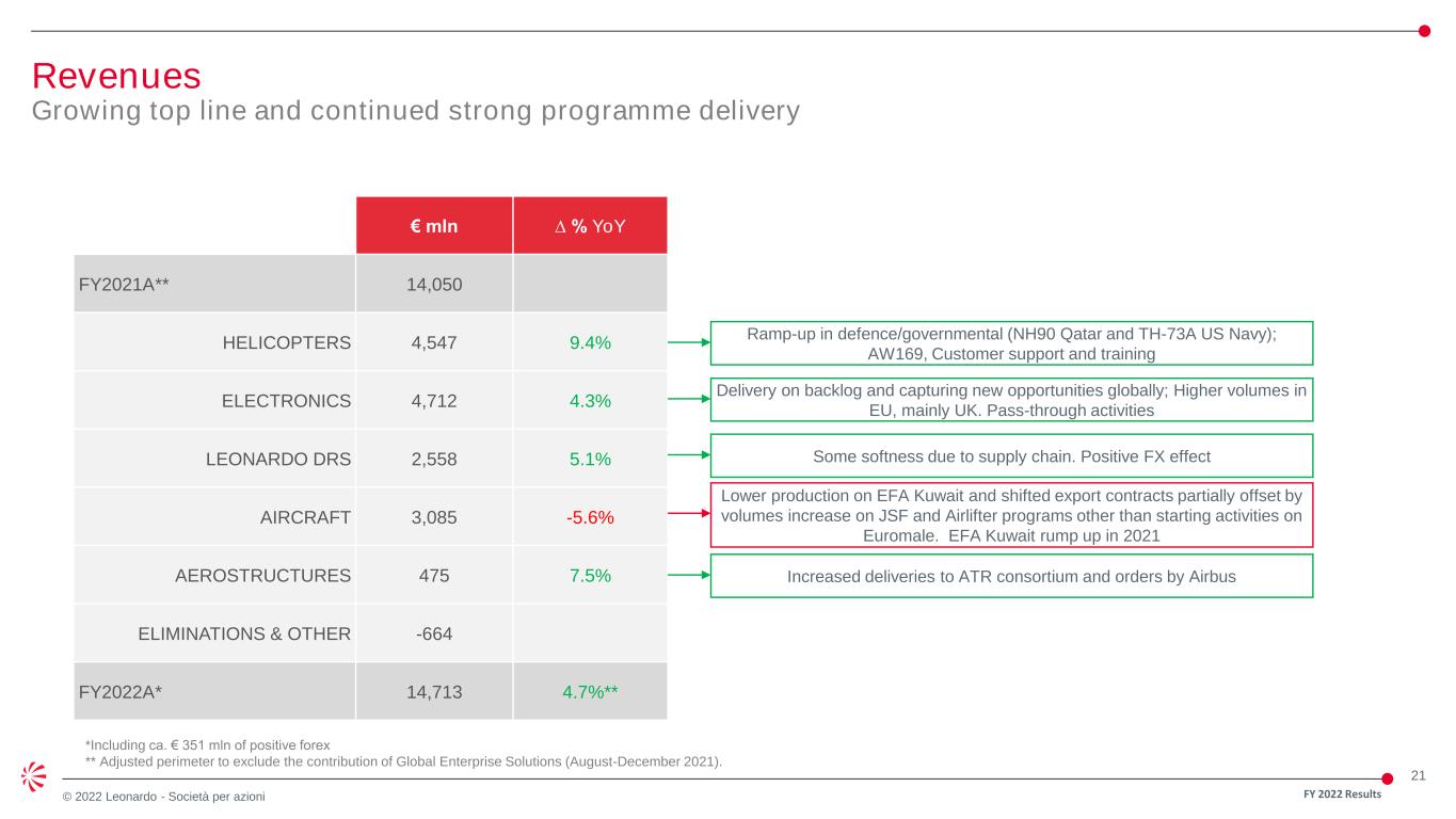 20 © 2022 Leonardo - Società per azioni Order Intake Continued strong commercial momentum € mln ∆ % YoY FY2021A** 14,267 HELICOPTERS 6,060 38.7% ELECTRONICS 5,628 4.4% LEONARDO DRS 2,997 36.6% AIRCRAFT 2,800 4.9% AEROSTRUCTURES 420 15.1% ELIMINATIONS & OTHER -639 FY2022A* 17,266 21.0%** 32 AW149 Poland; modernization of AW101/CH-149 “Cormorant” fleet; US Navy TH- 73A (AW119); 20 AW119Kx, 10 AW139, 4 AW169 LUH for Italy; 6 AW189 China; 5 AW119Kx Israel; MLU of 1 AW101; 4 AW609; various AW139 Commercial Export orders in Defence Systems mainly naval. Combat systems for German Navy and logistic support for Special and Diving Operations - Submarine Rescue Ship (SDO-SuRS). 20 EFA Spain Growing across advanced sensing, network computing, force protection and electric power and propulsion 20 EFA Spain; 1 C-27J for MoD Slovenia; first phase Euromale order, modernization of C-27J fleet for AMI, JSF and EFA logistics support Orders for A220 and A321. Euromale Programme FY 2022 Results *Including ca. € 404 mln of positive forex ** Adjusted perimeter to exclude the contribution of Global Enterprise Solutions (August-December 2021).
