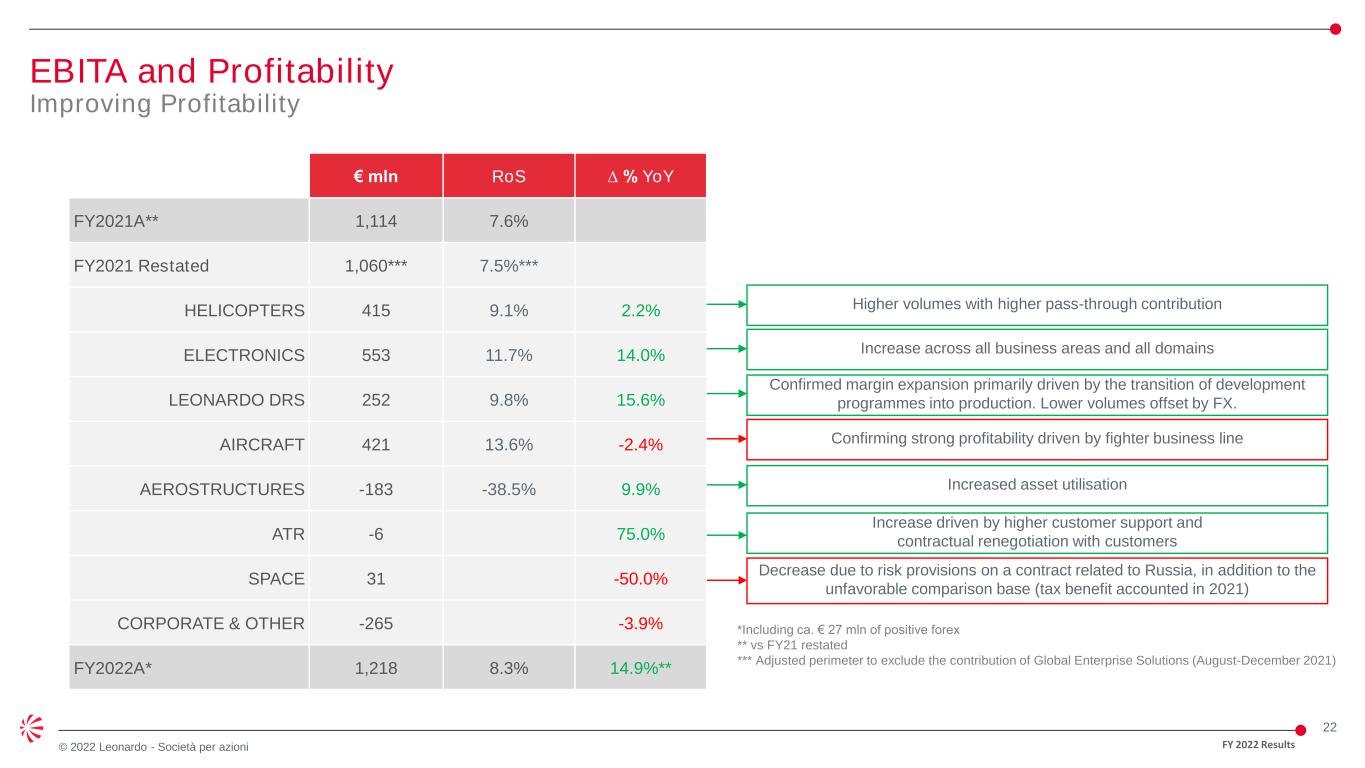21 © 2022 Leonardo - Società per azioni Revenues Growing top line and continued strong programme delivery € mln ∆ % YoY FY2021A** 14,050 HELICOPTERS 4,547 9.4% ELECTRONICS 4,712 4.3% LEONARDO DRS 2,558 5.1% AIRCRAFT 3,085 -5.6% AEROSTRUCTURES 475 7.5% ELIMINATIONS & OTHER -664 FY2022A* 14,713 4.7%** Ramp-up in defence/governmental (NH90 Qatar and TH-73A US Navy); AW169, Customer support and training Delivery on backlog and capturing new opportunities globally; Higher volumes in EU, mainly UK. Pass-through activities Some softness due to supply chain. Positive FX effect Lower production on EFA Kuwait and shifted export contracts partially offset by volumes increase on JSF and Airlifter programs other than starting activities on Euromale. EFA Kuwait rump up in 2021 Increased deliveries to ATR consortium and orders by Airbus FY 2022 Results *Including ca. € 351 mln of positive forex ** Adjusted perimeter to exclude the contribution of Global Enterprise Solutions (August-December 2021).