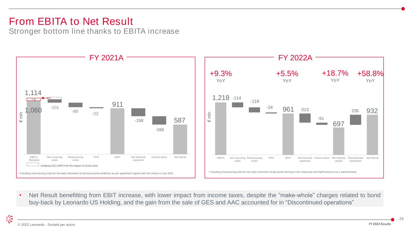 22 © 2022 Leonardo - Società per azioni EBITA and Profitability Improving Profitability € mln RoS ∆ % YoY FY2021A** 1,114 7.6% FY2021 Restated 1,060*** 7.5%*** HELICOPTERS 415 9.1% 2.2% ELECTRONICS 553 11.7% 14.0% LEONARDO DRS 252 9.8% 15.6% AIRCRAFT 421 13.6% -2.4% AEROSTRUCTURES -183 -38.5% 9.9% ATR -6 75.0% SPACE 31 -50.0% CORPORATE & OTHER -265 -3.9% FY2022A* 1,218 8.3% 14.9%** Higher volumes with higher pass-through contribution Increase across all business areas and all domains Confirmed margin expansion primarily driven by the transition of development programmes into production. Lower volumes offset by FX. Confirming strong profitability driven by fighter business line Increased asset utilisation Increase driven by higher customer support and contractual renegotiation with customers Decrease due to risk provisions on a contract related to Russia, in addition to the unfavorable comparison base (tax benefit accounted in 2021) FY 2022 Results *Including ca. € 27 mln of positive forex ** vs FY21 restated *** Adjusted perimeter to exclude the contribution of Global Enterprise Solutions (August-December 2021)