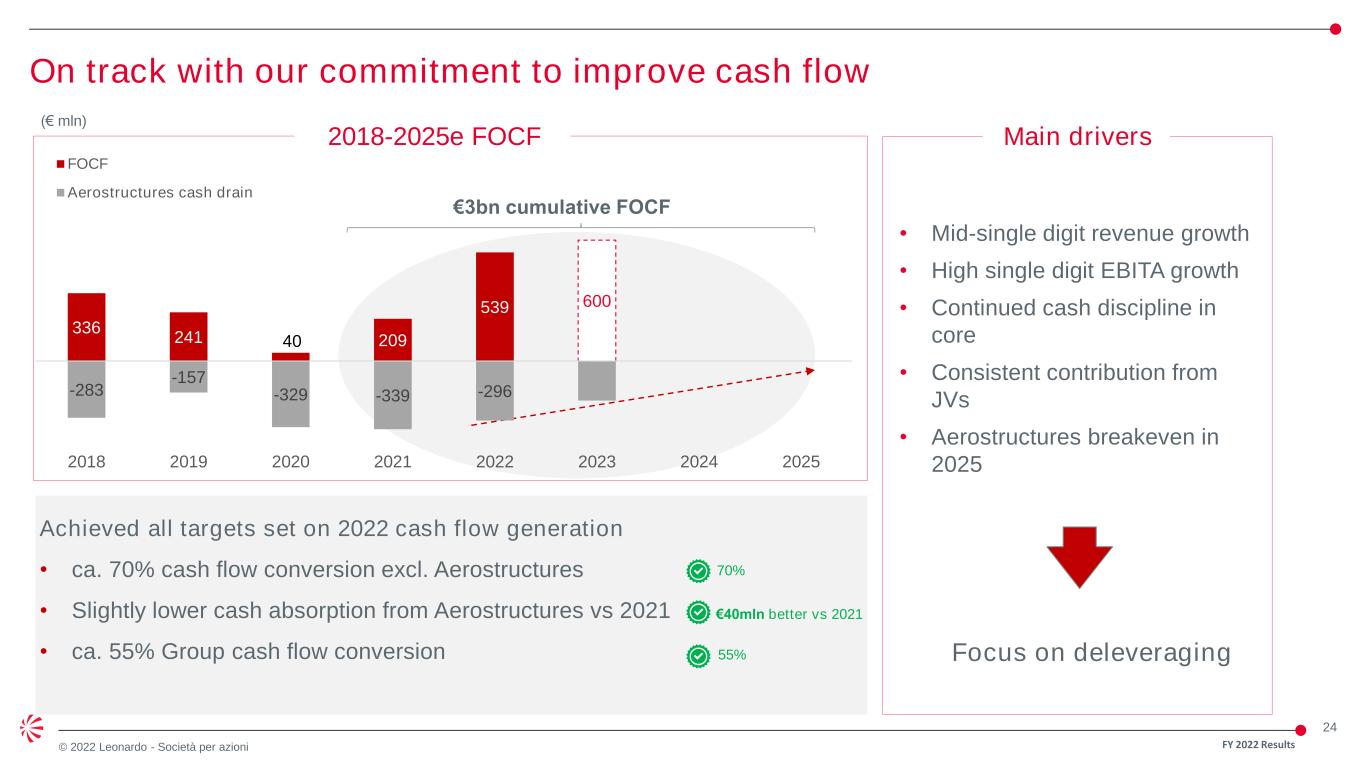 23 © 2022 Leonardo - Società per azioni From EBITA to Net Result Stronger bottom line thanks to EBITA increase +9.3% YoY +5.5% YoY € m ln FY 2022A -114 -119 -24 -213 -51 235 EBITA Non recurring costs Restructuring costs* PPA EBIT Net financial expenses Income taxes Net ordinary results Discontinued operations Net Result 932 +58.8% YoY * Including restructuring costs for the early retirement of personnel serving in the Corporate and Staff functions on a national basis 1,218 697 FY 2022 Results FY 2021A * Including restructuring costs for the early retirement of Aerostructures workforce as per agreement signed with the Unions in July 2021 • Net Result benefitting from EBIT increase, with lower impact from income taxes, despite the “make-whole” charges related to bond buy-back by Leonardo US Holding, and the gain from the sale of GES and AAC accounted for in “Discontinued operations” restating 2021 EBITA for the impact of covid costs € m ln 1,060 911 54 -101 -89 -22 -158 -166 EBITA Restated Non recurring costs Restructuring costs PPA EBIT Net financial expenses Income taxes Net Result 5 1,114 961 +18.7% YoY 587