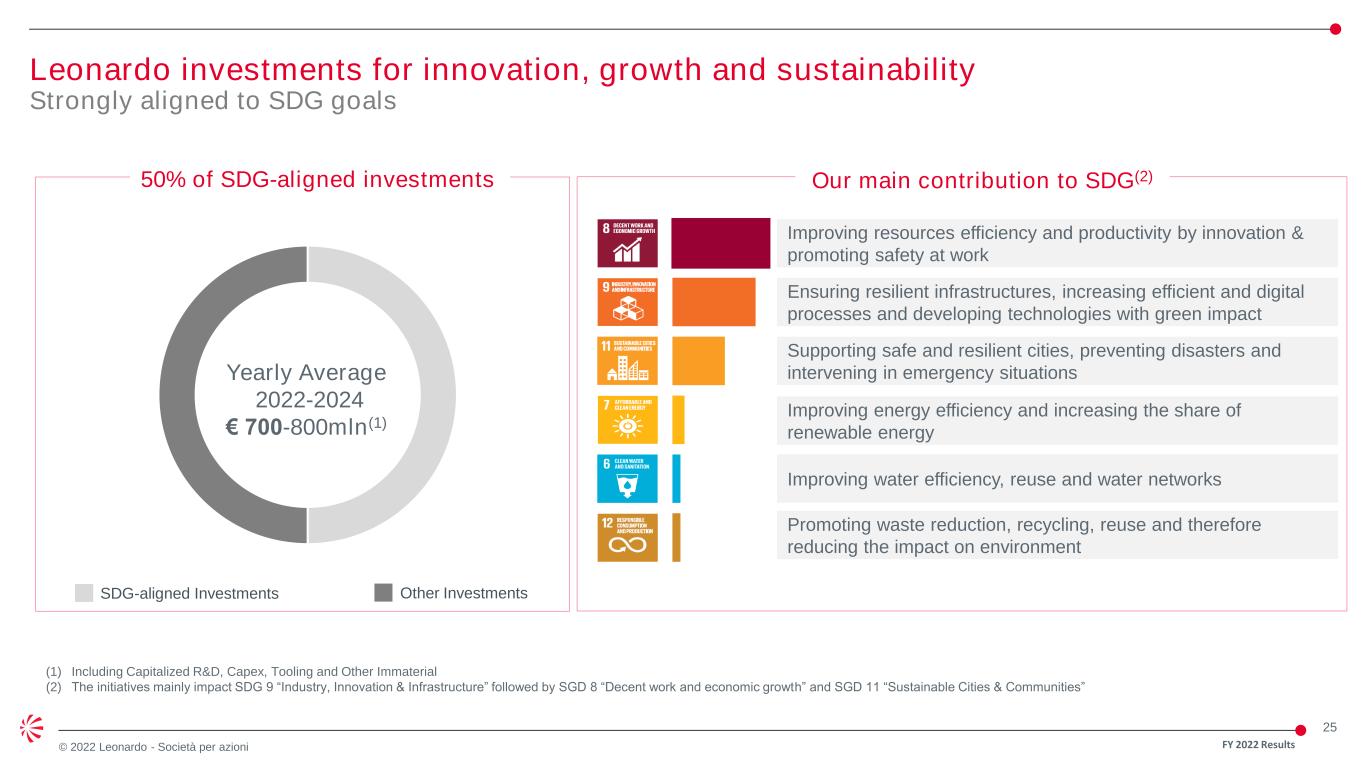 24 © 2022 Leonardo - Società per azioni On track with our commitment to improve cash flow • Mid-single digit revenue growth • High single digit EBITA growth • Continued cash discipline in core • Consistent contribution from JVs • Aerostructures breakeven in 2025 Focus on deleveraging Main drivers (€ mln) Achieved all targets set on 2022 cash flow generation • ca. 70% cash flow conversion excl. Aerostructures • Slightly lower cash absorption from Aerostructures vs 2021 • ca. 55% Group cash flow conversion 2018-2025e FOCF FY 2022 Results €40mln better vs 2021 70% 55% €3bn cumulative FOCF -283 -157 -329 -339 -296 336 241 40 209 539 600 2018 2019 2020 2021 2022 2023 2024 2025 FOCF Aerostructures cash drain