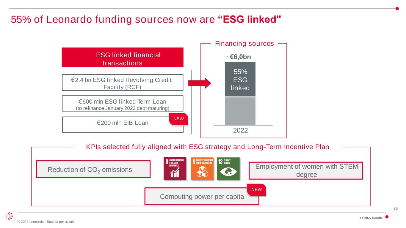 25 © 2022 Leonardo - Società per azioni FY 2022 Results Leonardo investments for innovation, growth and sustainability Strongly aligned to SDG goals (1) Including Capitalized R&D, Capex, Tooling and Other Immaterial (2) The initiatives mainly impact SDG 9 “Industry, Innovation & Infrastructure” followed by SGD 8 “Decent work and economic growth” and SGD 11 “Sustainable Cities & Communities” SDG-aligned Investments Other Investments Yearly Average 2022-2024 € 700-800mln(1) Ensuring resilient infrastructures, increasing efficient and digital processes and developing technologies with green impact Improving resources efficiency and productivity by innovation & promoting safety at work Supporting safe and resilient cities, preventing disasters and intervening in emergency situations Improving water efficiency, reuse and water networks Improving energy efficiency and increasing the share of renewable energy Promoting waste reduction, recycling, reuse and therefore reducing the impact on environment 50% of SDG-aligned investments Our main contribution to SDG(2)