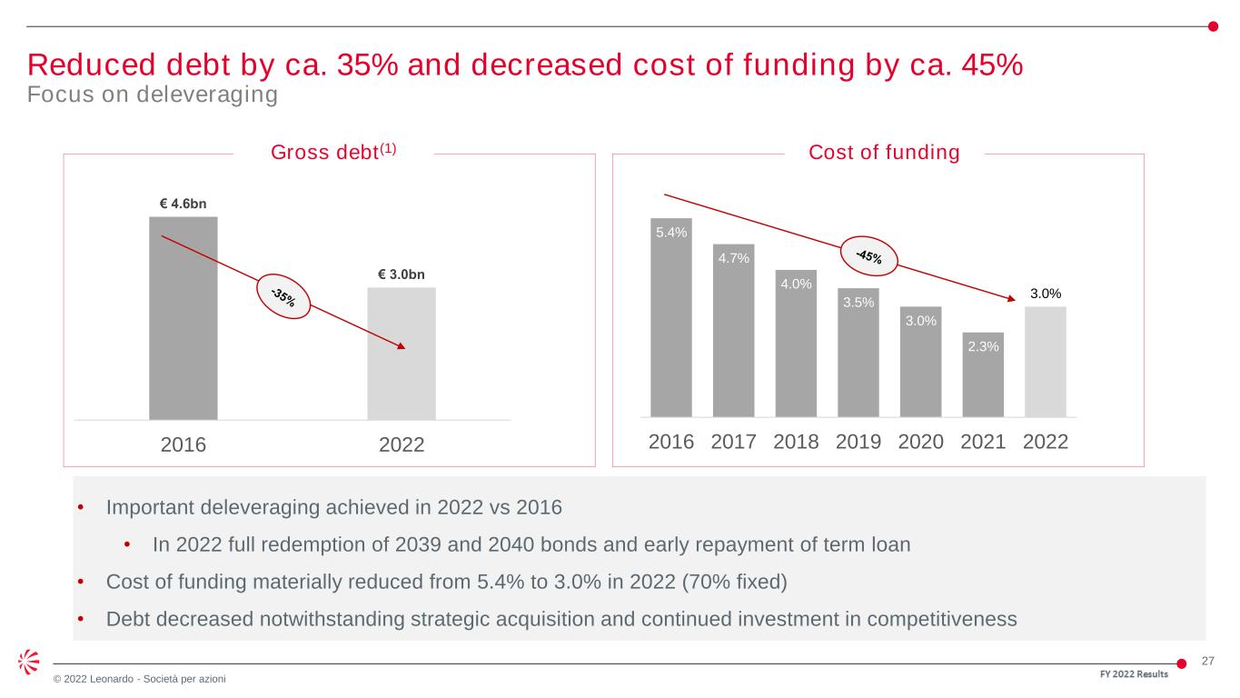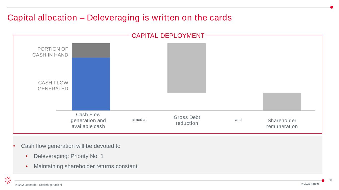 27 © 2022 Leonardo - Società per azioni Reduced debt by ca. 35% and decreased cost of funding by ca. 45% Focus on deleveraging 5.4% 4.7% 4.0% 3.5% 3.0% 2.3% 3.0% 2016 2017 2018 2019 2020 2021 2022 € 4.6bn € 3.0bn 2016 2022 • Important deleveraging achieved in 2022 vs 2016 • In 2022 full redemption of 2039 and 2040 bonds and early repayment of term loan • Cost of funding materially reduced from 5.4% to 3.0% in 2022 (70% fixed) • Debt decreased notwithstanding strategic acquisition and continued investment in competitiveness Gross debt(1) Cost of funding