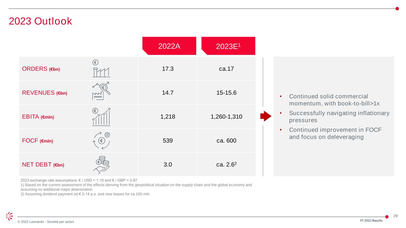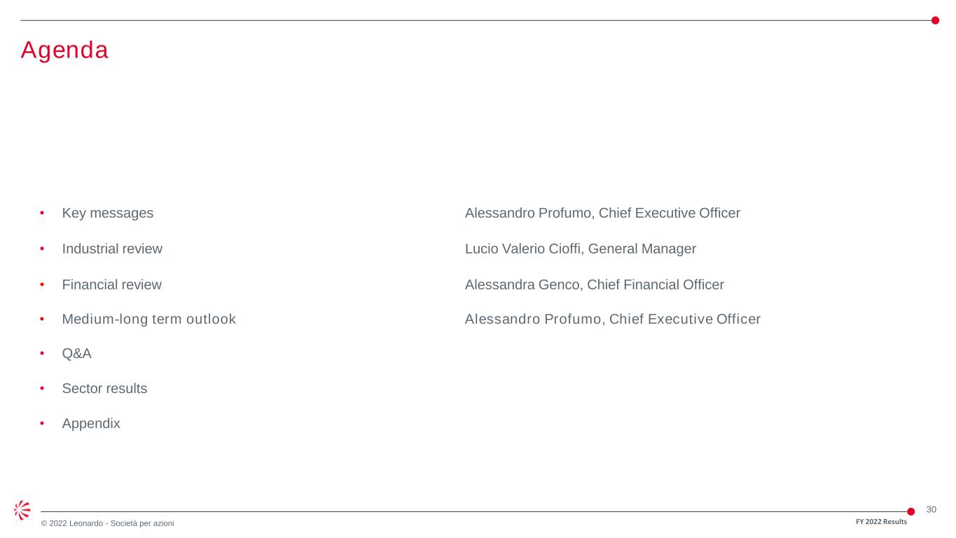 29 © 2022 Leonardo - Società per azioni 2023 Outlook ORDERS (€bn) 17.3 ca.17 REVENUES (€bn) 14.7 15-15.6 EBITA (€mln) 1,218 1,260-1,310 FOCF (€mln) 539 ca. 600 NET DEBT (€bn) 3.0 ca. 2.62 2022A 2023E1 • Continued solid commercial momentum, with book-to-bill>1x • Successfully navigating inflationary pressures • Continued improvement in FOCF and focus on deleveraging 2023 exchange rate assumptions: € / USD = 1.10 and € / GBP = 0.87 1) Based on the current assessment of the effects deriving from the geopolitical situation on the supply chain and the global economy and assuming no additional major deterioration 2) Assuming dividend payment od € 0.14 p.s. and new leases for ca 100 mln