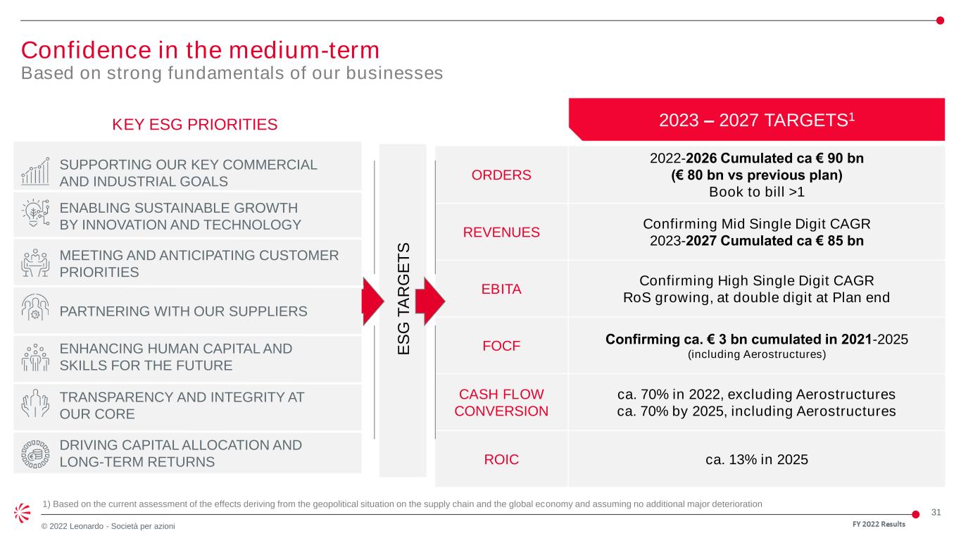 30 © 2022 Leonardo - Società per azioni Agenda FY 2022 Results • Key messages • Industrial review • Financial review • Q&A • Sector results • Appendix Alessandro Profumo, Chief Executive Officer Lucio Valerio Cioffi, General Manager Alessandra Genco, Chief Financial Officer • Medium-long term outlook Alessandro Profumo, Chief Executive Officer