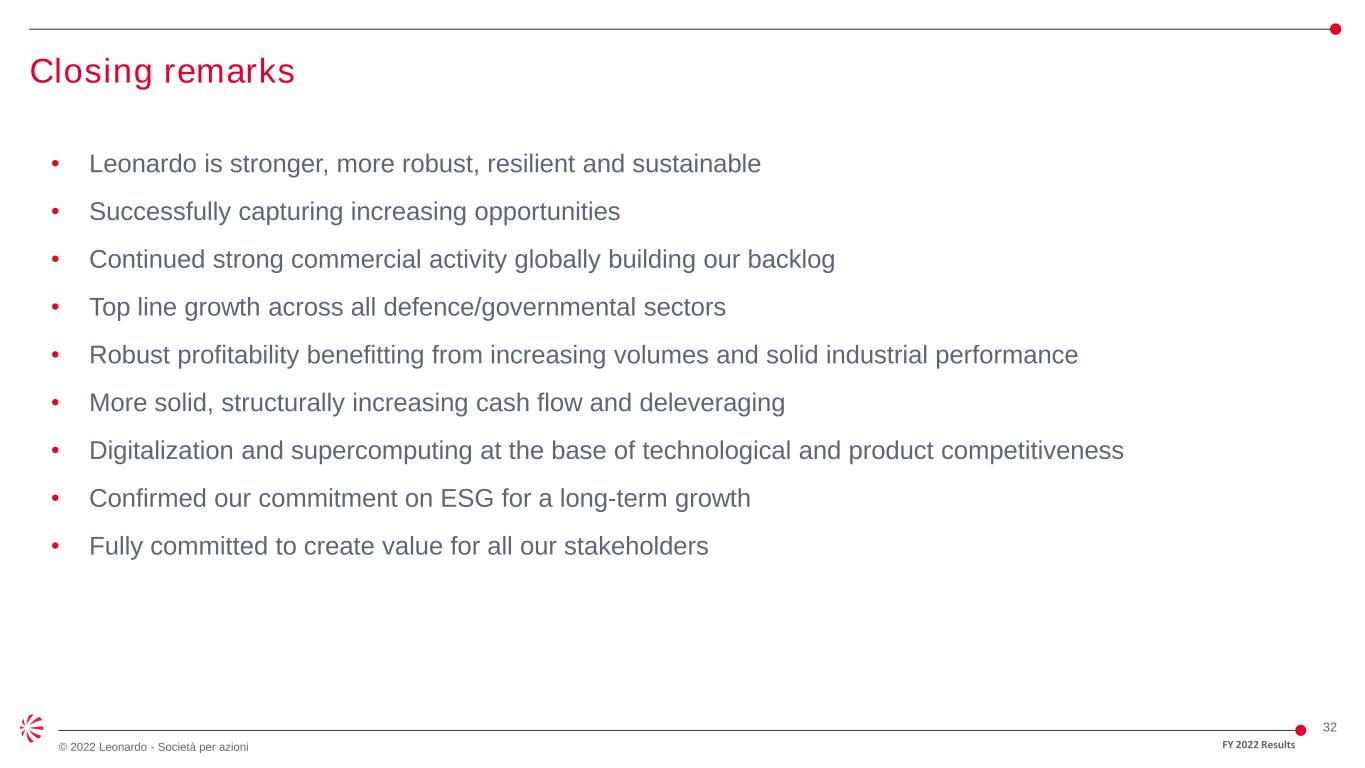 31 © 2022 Leonardo - Società per azioni Confidence in the medium-term Based on strong fundamentals of our businesses ORDERS 2022-2026 Cumulated ca € 90 bn (€ 80 bn vs previous plan) Book to bill >1 REVENUES Confirming Mid Single Digit CAGR 2023-2027 Cumulated ca € 85 bn EBITA Confirming High Single Digit CAGR RoS growing, at double digit at Plan end FOCF Confirming ca. € 3 bn cumulated in 2021-2025 (including Aerostructures) CASH FLOW CONVERSION ca. 70% in 2022, excluding Aerostructures ca. 70% by 2025, including Aerostructures ROIC ca. 13% in 2025 2023 – 2027 TARGETS1 E S G T A R G E T S KEY ESG PRIORITIES ENHANCING HUMAN CAPITAL AND SKILLS FOR THE FUTURE MEETING AND ANTICIPATING CUSTOMER PRIORITIES ENABLING SUSTAINABLE GROWTH BY INNOVATION AND TECHNOLOGY PARTNERING WITH OUR SUPPLIERS TRANSPARENCY AND INTEGRITY AT OUR CORE DRIVING CAPITAL ALLOCATION AND LONG-TERM RETURNS SUPPORTING OUR KEY COMMERCIAL AND INDUSTRIAL GOALS 1) Based on the current assessment of the effects deriving from the geopolitical situation on the supply chain and the global economy and assuming no additional major deterioration