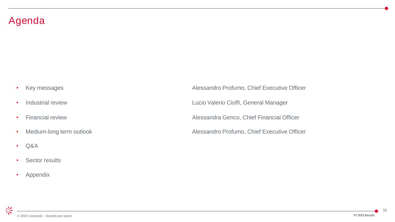 32 © 2022 Leonardo - Società per azioni Closing remarks • Leonardo is stronger, more robust, resilient and sustainable • Successfully capturing increasing opportunities • Continued strong commercial activity globally building our backlog • Top line growth across all defence/governmental sectors • Robust profitability benefitting from increasing volumes and solid industrial performance • More solid, structurally increasing cash flow and deleveraging • Digitalization and supercomputing at the base of technological and product competitiveness • Confirmed our commitment on ESG for a long-term growth • Fully committed to create value for all our stakeholders FY 2022 Results