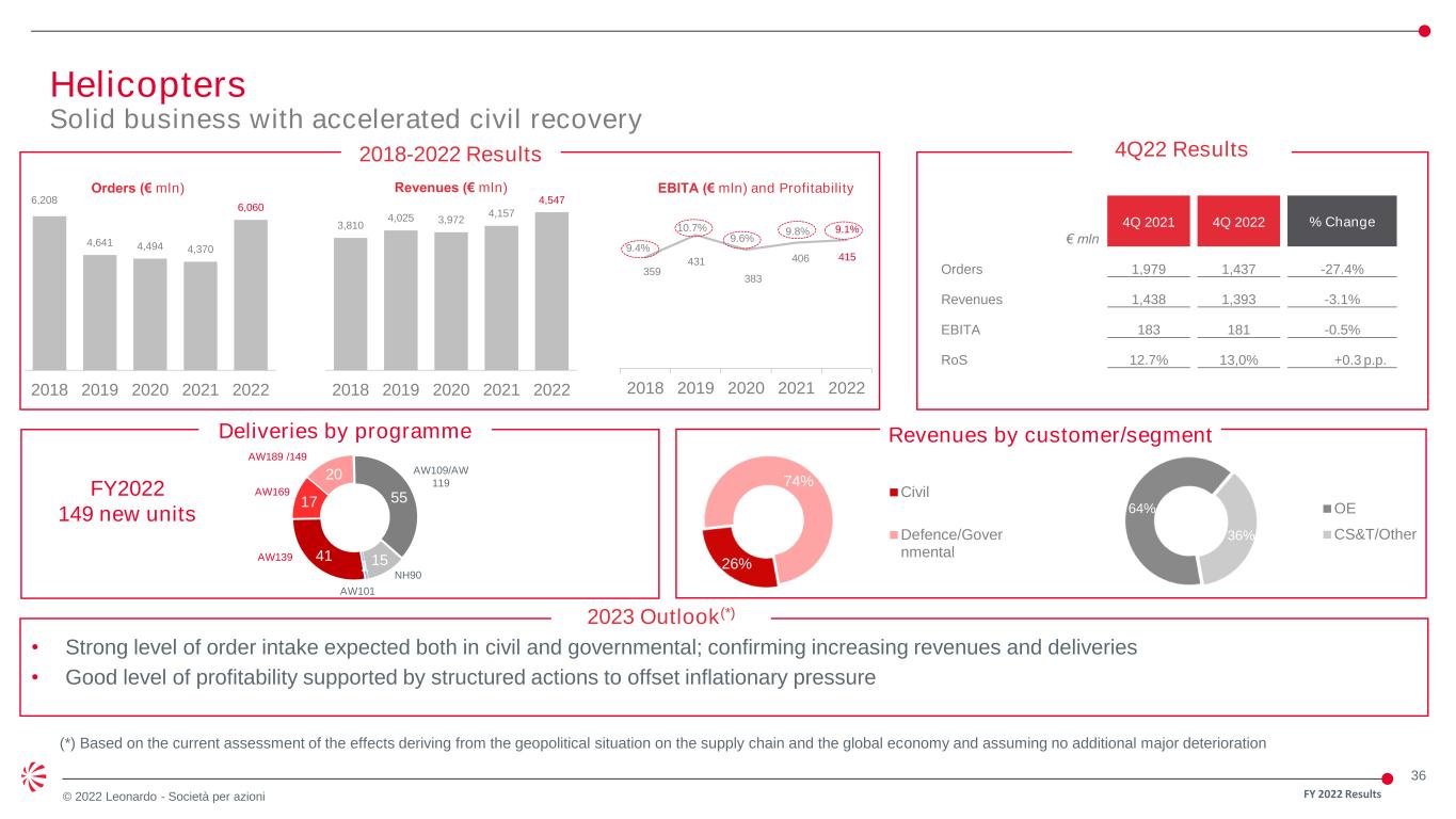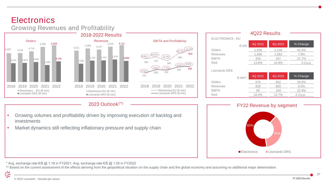36 © 2022 Leonardo - Società per azioni 6,208 4,641 4,494 4,370 6,060 2018 2019 2020 2021 2022 2018-2022 Results 3,810 4,025 3,972 4,157 4,547 2018 2019 2020 2021 2022 € mln 4Q 2021 4Q 2022 % Change Orders 1,979 1,437 -27.4% Revenues 1,438 1,393 -3.1% EBITA 183 181 -0.5% RoS 12.7% 13,0% +0.3 p.p. 4Q22 Results Orders (€ mln) Revenues (€ mln) EBITA (€ mln) and Profitability 2023 Outlook(*) • Strong level of order intake expected both in civil and governmental; confirming increasing revenues and deliveries • Good level of profitability supported by structured actions to offset inflationary pressure 359 431 383 406 415 9.4% 10.7% 9.6% 9.8% 9.1% 2018 2019 2020 2021 2022 Helicopters Solid business with accelerated civil recovery (*) Based on the current assessment of the effects deriving from the geopolitical situation on the supply chain and the global economy and assuming no additional major deterioration FY 2022 Results FY2022 149 new units 41 17 20 55 151 AW139 AW169 AW189 /149 AW109/AW 119 NH90 AW101 Deliveries by programme 64% 36% OE CS&T/Other 26% 74% Civil Defence/Gover nmental Revenues by customer/segment