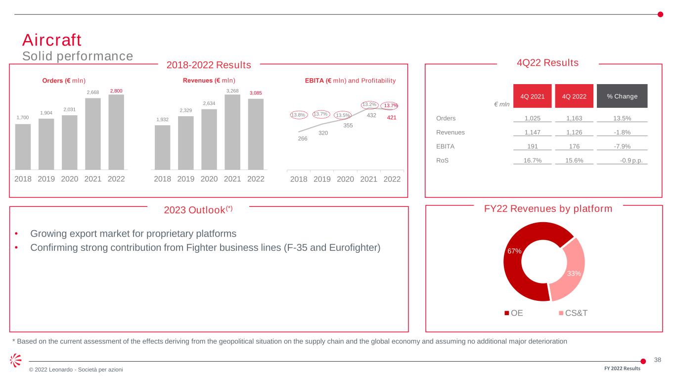37 © 2022 Leonardo - Società per azioni 4,409 4,444 4,710 5,392 5,628 2,879 2,923 3,054 2,595 3,156 2018 2019 2020 2021 2022 Electronics - EU (€ mln) Leonardo DRS ($ mln) 2018-2022 Results 394 427 360 485 553 151 208 202 258 265 9.8% 10.0% 8.7% 10.7% 11.7% 6.5% 7.6% 7.3% 9.0% 9.8% 2018 2019 2020 2021 2022 Electronics EU (€ mln) Leonardo DRS ($ mln) 4,011 4,289 4,147 4,519 4,712 2,339 2,729 2,757 2,879 2,693 2018 2019 2020 2021 2022 Electronics EU (€ mln) Leonardo DRS ($ mln) ELECTRONICS - EU € mln 4Q 2021 4Q 2022 % Change Orders 1,529 2,134 41.5% Revenues 1,496 1,562 7.9% EBITA 203 247 21.7% RoS 13.6% 15.8% 2.2 p.p. Leonardo DRS $ mln(*) 4Q 2021 4Q 2022 % Change Orders 676 852 26.0% Revenues 820 820 0.0% EBITA 85 104 22.4% RoS 10.4% 12.7% 2.3 p.p. 4Q22 Results Orders Revenues EBITA and Profitability 2023 Outlook(**) • Growing volumes and profitability driven by improving execution of backlog and investments • Market dynamics still reflecting inflationary pressure and supply chain * Avg. exchange rate €/$ @ 1.18 in FY2021; Avg. exchange rate €/$ @ 1.05 in FY2022 ** Based on the current assessment of the effects deriving from the geopolitical situation on the supply chain and the global economy and assuming no additional major deterioration FY 2022 Results Electronics Growing Revenues and Profitability FY22 Revenue by segment 65% 35% Electronics Leonardo DRS
