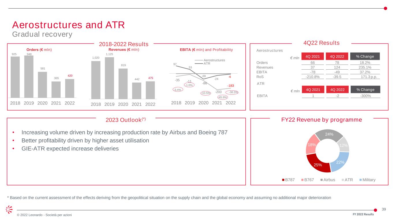 38 © 2022 Leonardo - Società per azioni 1,700 1,904 2,031 2,668 2,800 2018 2019 2020 2021 2022 2018-2022 Results 1,932 2,329 2,634 3,268 3,085 2018 2019 2020 2021 2022 € mln 4Q 2021 4Q 2022 % Change Orders 1,025 1,163 13.5% Revenues 1,147 1,126 -1.8% EBITA 191 176 -7.9% RoS 16.7% 15.6% -0.9 p.p. 4Q22 Results Orders (€ mln) Revenues (€ mln) EBITA (€ mln) and Profitability 2023 Outlook(*) • Growing export market for proprietary platforms • Confirming strong contribution from Fighter business lines (F-35 and Eurofighter) * Based on the current assessment of the effects deriving from the geopolitical situation on the supply chain and the global economy and assuming no additional major deterioration Aircraft Solid performance FY 2022 Results 266 320 355 432 421 13.8% 13.7% 13.5% 13.2% 13.7% 2018 2019 2020 2021 2022 FY22 Revenues by platform 67% 33% OE CS&T