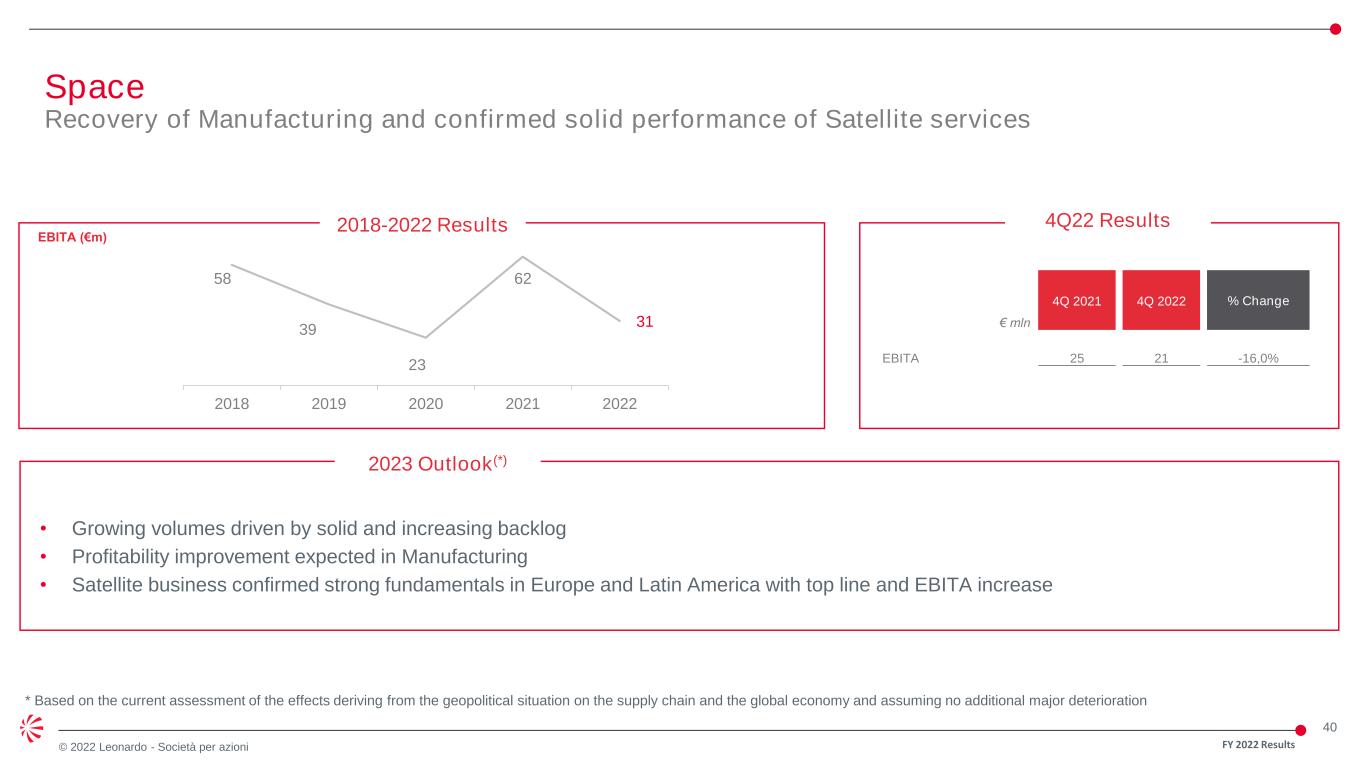 39 © 2022 Leonardo - Società per azioni 925 948 581 365 420 2018 2019 2020 2021 2022 2018-2022 Results 1,020 1,125 819 442 475 2018 2019 2020 2021 2022 Aerostructures € mln 4Q 2021 4Q 2022 % Change Orders 66 78 18.2% Revenues 37 124 235.1% EBITA -78 -49 37.2% RoS -210.8% -39.5 171.3 p.p. 4Q22 Results Orders (€ mln) Revenues (€ mln) EBITA (€ mln) and Profitability 2023 Outlook(*) • Increasing volume driven by increasing production rate by Airbus and Boeing 787 • Better profitability driven by higher asset utilisation • GIE-ATR expected increase deliveries * Based on the current assessment of the effects deriving from the geopolitical situation on the supply chain and the global economy and assuming no additional major deterioration Aerostructures and ATR Gradual recovery FY 2022 Results -35 -11 -86 -203 -183 97 53 -69 -24 -6 -3.4% -1.0% -10.5% -45.9% -38.5% 2018 2019 2020 2021 2022 Aerostructures ATR FY22 Revenue by programme ATR € mln 4Q 2021 4Q 2022 % Change EBITA 1 -2 -300% 25% 18% 24% 12% 22% B787 B767 Airbus ATR Military