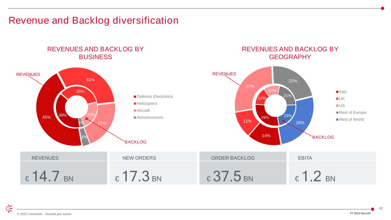 41 © 2022 Leonardo - Società per azioni Agenda FY 2022 Results • Key messages • Industrial review • Financial review • Q&A • Sector results • Appendix Alessandro Profumo, Chief Executive Officer Lucio Valerio Cioffi, General Manager Alessandra Genco, Chief Financial Officer • Medium-long term outlook Alessandro Profumo, Chief Executive Officer