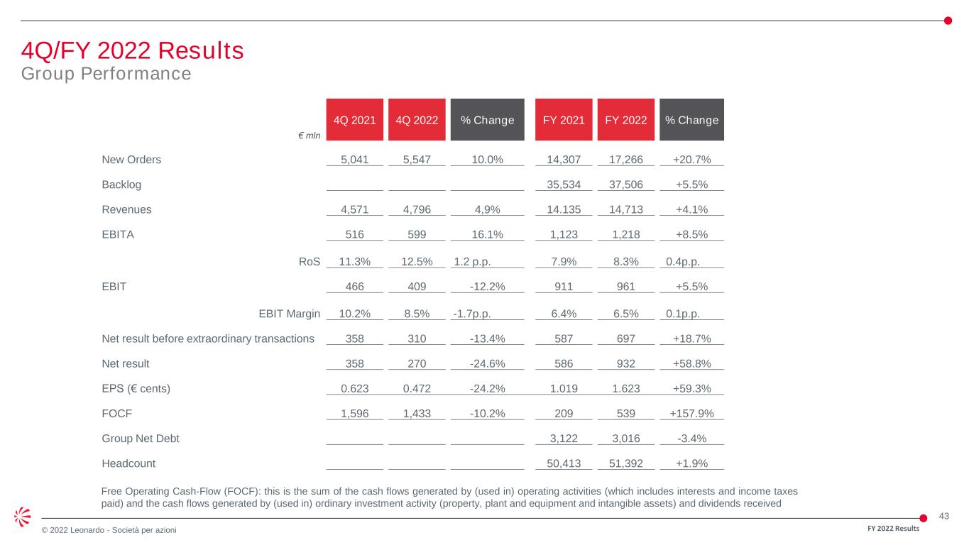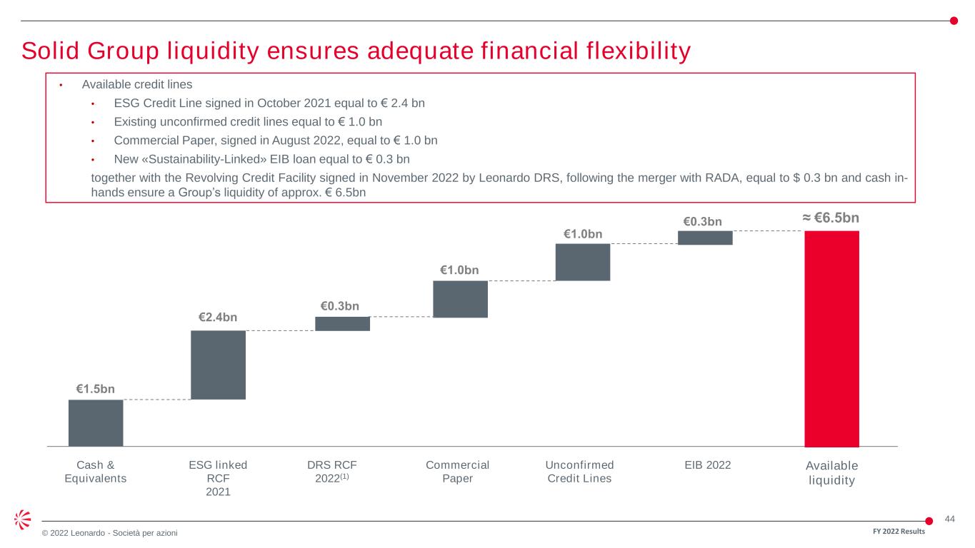 43 © 2022 Leonardo - Società per azioni 4Q/FY 2022 Results Group Performance Free Operating Cash-Flow (FOCF): this is the sum of the cash flows generated by (used in) operating activities (which includes interests and income taxes paid) and the cash flows generated by (used in) ordinary investment activity (property, plant and equipment and intangible assets) and dividends received € mln 4Q 2021 4Q 2022 % Change FY 2021 FY 2022 % Change New Orders 5,041 5,547 10.0% 14,307 17,266 +20.7% Backlog 35,534 37,506 +5.5% Revenues 4,571 4,796 4,9% 14.135 14,713 +4.1% EBITA 516 599 16.1% 1,123 1,218 +8.5% RoS 11.3% 12.5% 1.2 p.p. 7.9% 8.3% 0.4p.p. EBIT 466 409 -12.2% 911 961 +5.5% EBIT Margin 10.2% 8.5% -1.7p.p. 6.4% 6.5% 0.1p.p. Net result before extraordinary transactions 358 310 -13.4% 587 697 +18.7% Net result 358 270 -24.6% 586 932 +58.8% EPS (€ cents) 0.623 0.472 -24.2% 1.019 1.623 +59.3% FOCF 1,596 1,433 -10.2% 209 539 +157.9% Group Net Debt 3,122 3,016 -3.4% Headcount 50,413 51,392 +1.9% FY 2022 Results