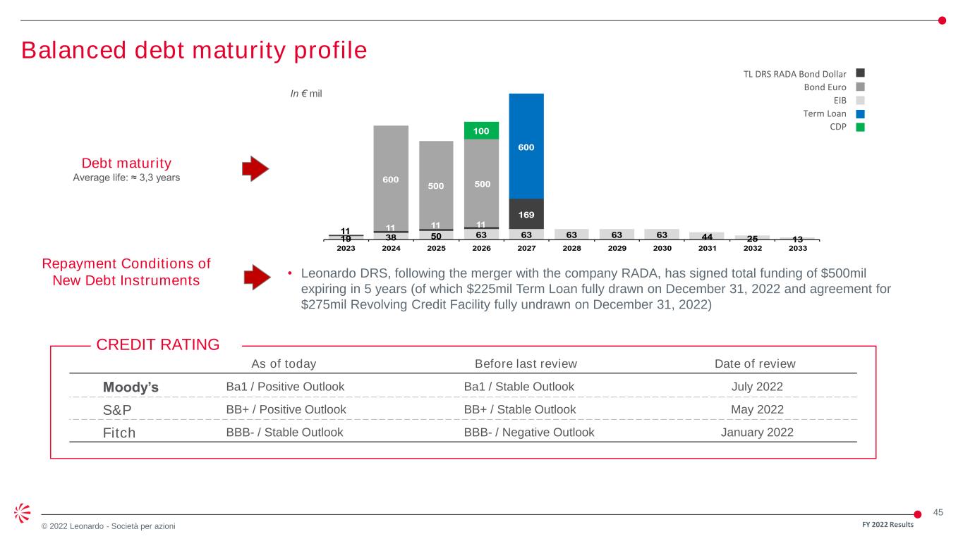 44 © 2022 Leonardo - Società per azioni FY 2022 Results • Available credit lines • ESG Credit Line signed in October 2021 equal to € 2.4 bn • Existing unconfirmed credit lines equal to € 1.0 bn • Commercial Paper, signed in August 2022, equal to € 1.0 bn • New «Sustainability-Linked» EIB loan equal to € 0.3 bn together with the Revolving Credit Facility signed in November 2022 by Leonardo DRS, following the merger with RADA, equal to $ 0.3 bn and cash in- hands ensure a Group’s liquidity of approx. € 6.5bn Cash & Equivalents €1.5bn ESG linked RCF 2021 €2.4bn Unconfirmed Credit Lines €1.0bn EIB 2022 €0.3bn Available liquidity ≈ €6.5bn Commercial Paper €1.0bn DRS RCF 2022(1) €0.3bn Solid Group liquidity ensures adequate financial flexibility