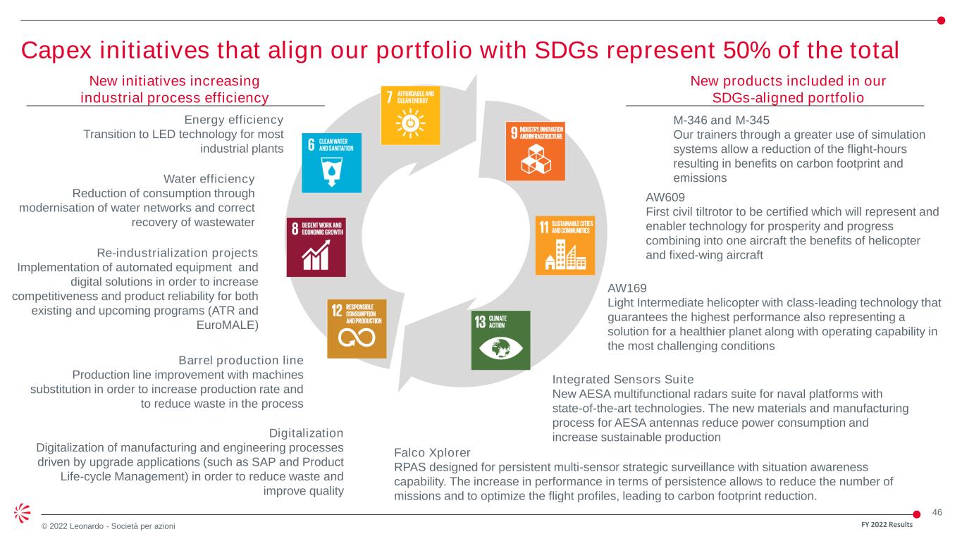 46 © 2022 Leonardo - Società per azioni FY 2022 Results Capex initiatives that align our portfolio with SDGs represent 50% of the total New initiatives increasing industrial process efficiency New products included in our SDGs-aligned portfolio AW609 First civil tiltrotor to be certified which will represent and enabler technology for prosperity and progress combining into one aircraft the benefits of helicopter and fixed-wing aircraft M-346 and M-345 Our trainers through a greater use of simulation systems allow a reduction of the flight-hours resulting in benefits on carbon footprint and emissions AW169 Light Intermediate helicopter with class-leading technology that guarantees the highest performance also representing a solution for a healthier planet along with operating capability in the most challenging conditions Integrated Sensors Suite New AESA multifunctional radars suite for naval platforms with state-of-the-art technologies. The new materials and manufacturing process for AESA antennas reduce power consumption and increase sustainable production Falco Xplorer RPAS designed for persistent multi-sensor strategic surveillance with situation awareness capability. The increase in performance in terms of persistence allows to reduce the number of missions and to optimize the flight profiles, leading to carbon footprint reduction. Barrel production line Production line improvement with machines substitution in order to increase production rate and to reduce waste in the process Digitalization Digitalization of manufacturing and engineering processes driven by upgrade applications (such as SAP and Product Life-cycle Management) in order to reduce waste and improve quality Energy efficiency Transition to LED technology for most industrial plants Re-industrialization projects Implementation of automated equipment and digital solutions in order to increase competitiveness and product reliability for both existing and upcoming programs (ATR and EuroMALE) Water efficiency Reduction of consumption through modernisation of water networks and correct recovery of wastewater