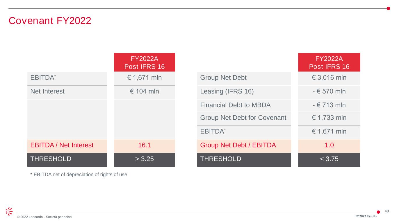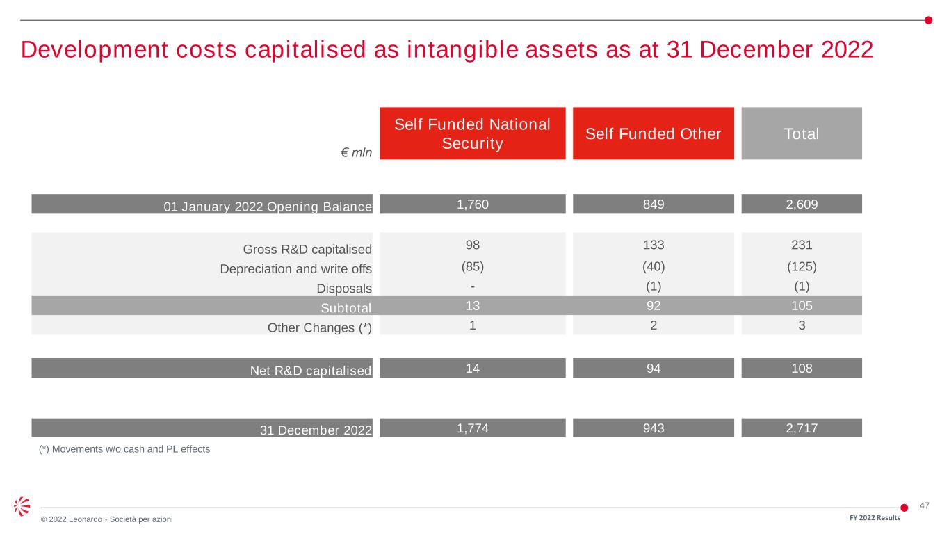 47 © 2022 Leonardo - Società per azioni FY 2022 Results Development costs capitalised as intangible assets as at 31 December 2022 (*) Movements w/o cash and PL effects € mln Self Funded National Security Self Funded Other Total 01 January 2022 Opening Balance 1,760 849 2,609 Gross R&D capitalised 98 133 231 Depreciation and write offs (85) (40) (125) Disposals - (1) (1) Subtotal 13 92 105 Other Changes (*) 1 2 3 Net R&D capitalised 14 94 108 31 December 2022 1,774 943 2,717