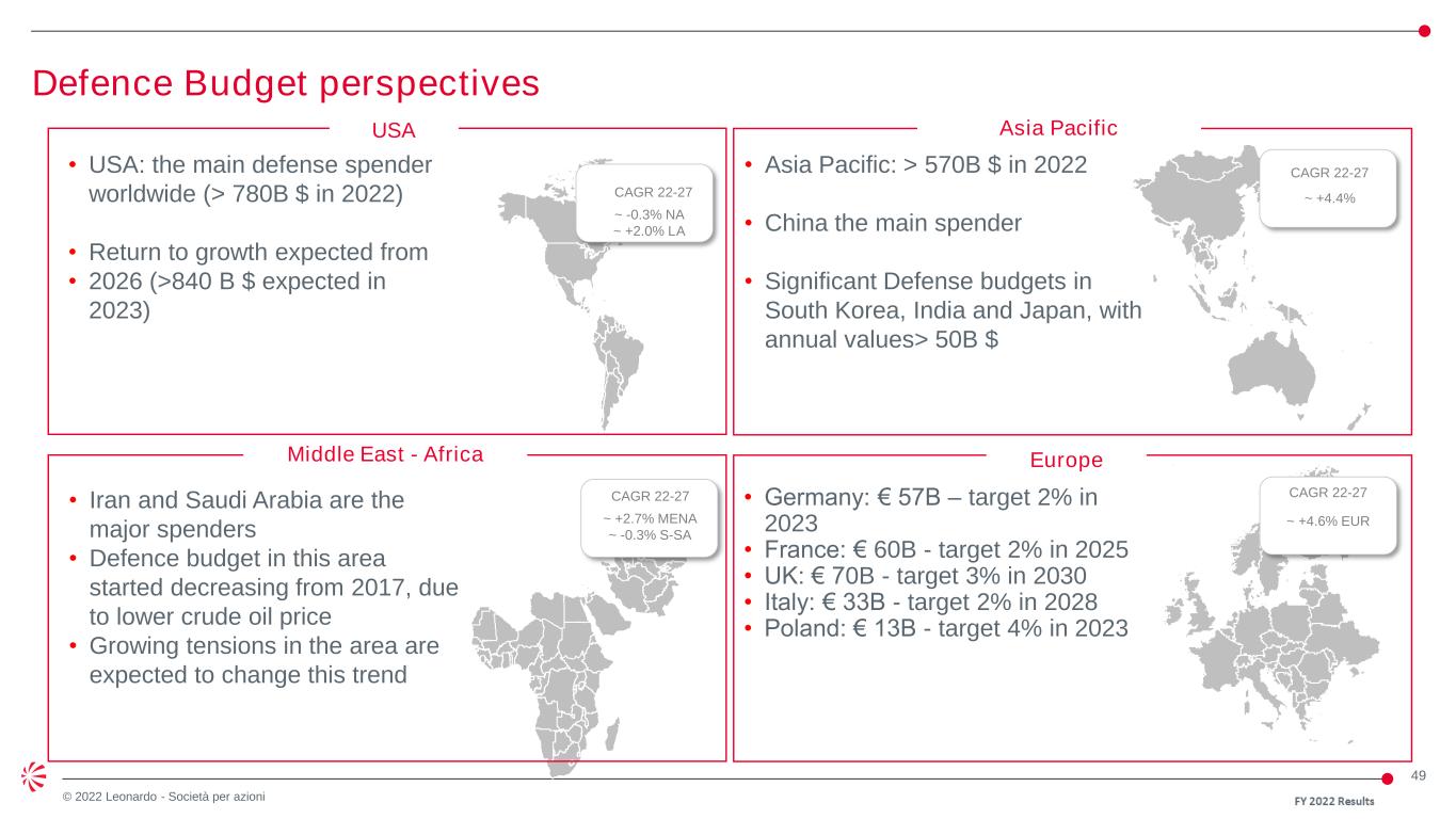 49 © 2022 Leonardo - Società per azioni Defence Budget perspectives • USA: the main defense spender worldwide (> 780B $ in 2022) • Return to growth expected from • 2026 (>840 B $ expected in 2023) • Asia Pacific: > 570B $ in 2022 • China the main spender • Significant Defense budgets in South Korea, India and Japan, with annual values> 50B $ • Iran and Saudi Arabia are the major spenders • Defence budget in this area started decreasing from 2017, due to lower crude oil price • Growing tensions in the area are expected to change this trend • Germany: € 57B – target 2% in 2023 • France: € 60B - target 2% in 2025 • UK: € 70B - target 3% in 2030 • Italy: € 33B - target 2% in 2028 • Poland: € 13B - target 4% in 2023 USA Asia Pacific Europe Middle East - Africa CAGR 22-27 ~ +4.4%CAGR 22-27 ~ -0.3% NA ~ +2.0% LA CAGR 22-27 ~ +2.7% MENA ~ -0.3% S-SA CAGR 22-27 ~ +4.6% EUR