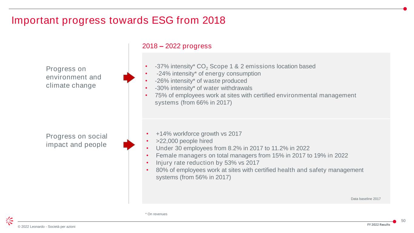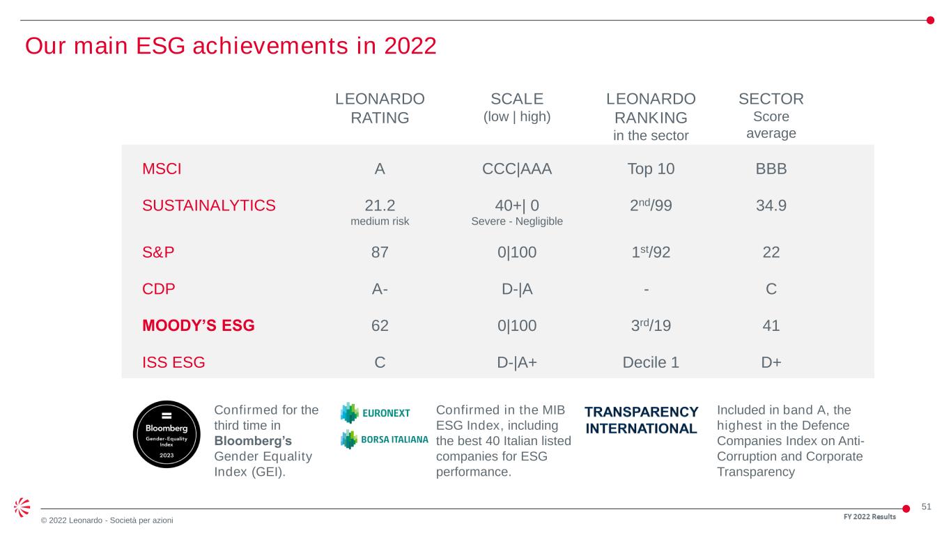50 © 2022 Leonardo - Società per azioni Important progress towards ESG from 2018 • -37% intensity* CO2 Scope 1 & 2 emissions location based • -24% intensity* of energy consumption • -26% intensity* of waste produced • -30% intensity* of water withdrawals • 75% of employees work at sites with certified environmental management systems (from 66% in 2017) • +14% workforce growth vs 2017 • >22,000 people hired • Under 30 employees from 8.2% in 2017 to 11.2% in 2022 • Female managers on total managers from 15% in 2017 to 19% in 2022 • Injury rate reduction by 53% vs 2017 • 80% of employees work at sites with certified health and safety management systems (from 56% in 2017) Progress on environment and climate change Progress on social impact and people 2018 – 2022 progress Data baseline 2017 * On revenues