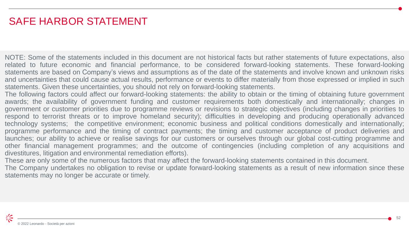 52 © 2022 Leonardo - Società per azioni SAFE HARBOR STATEMENT NOTE: Some of the statements included in this document are not historical facts but rather statements of future expectations, also related to future economic and financial performance, to be considered forward-looking statements. These forward-looking statements are based on Company’s views and assumptions as of the date of the statements and involve known and unknown risks and uncertainties that could cause actual results, performance or events to differ materially from those expressed or implied in such statements. Given these uncertainties, you should not rely on forward-looking statements. The following factors could affect our forward-looking statements: the ability to obtain or the timing of obtaining future government awards; the availability of government funding and customer requirements both domestically and internationally; changes in government or customer priorities due to programme reviews or revisions to strategic objectives (including changes in priorities to respond to terrorist threats or to improve homeland security); difficulties in developing and producing operationally advanced technology systems; the competitive environment; economic business and political conditions domestically and internationally; programme performance and the timing of contract payments; the timing and customer acceptance of product deliveries and launches; our ability to achieve or realise savings for our customers or ourselves through our global cost-cutting programme and other financial management programmes; and the outcome of contingencies (including completion of any acquisitions and divestitures, litigation and environmental remediation efforts). These are only some of the numerous factors that may affect the forward-looking statements contained in this document. The Company undertakes no obligation to revise or update forward-looking statements as a result of new information since these statements may no longer be accurate or timely.