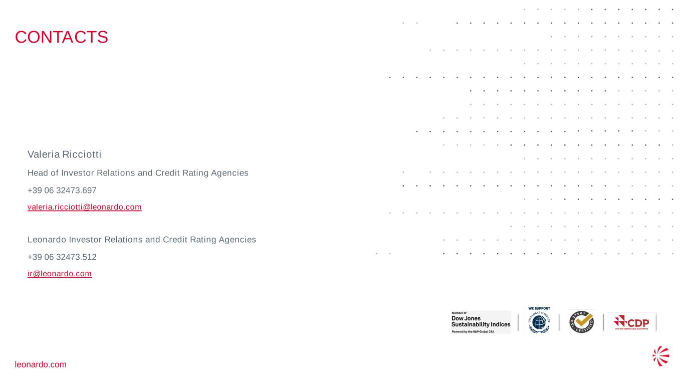 53 © 2022 Leonardo - Società per azioni CONTACTS leonardo.com Valeria Ricciotti Head of Investor Relations and Credit Rating Agencies +39 06 32473.697 valeria.ricciotti@leonardo.com Leonardo Investor Relations and Credit Rating Agencies +39 06 32473.512 ir@leonardo.com