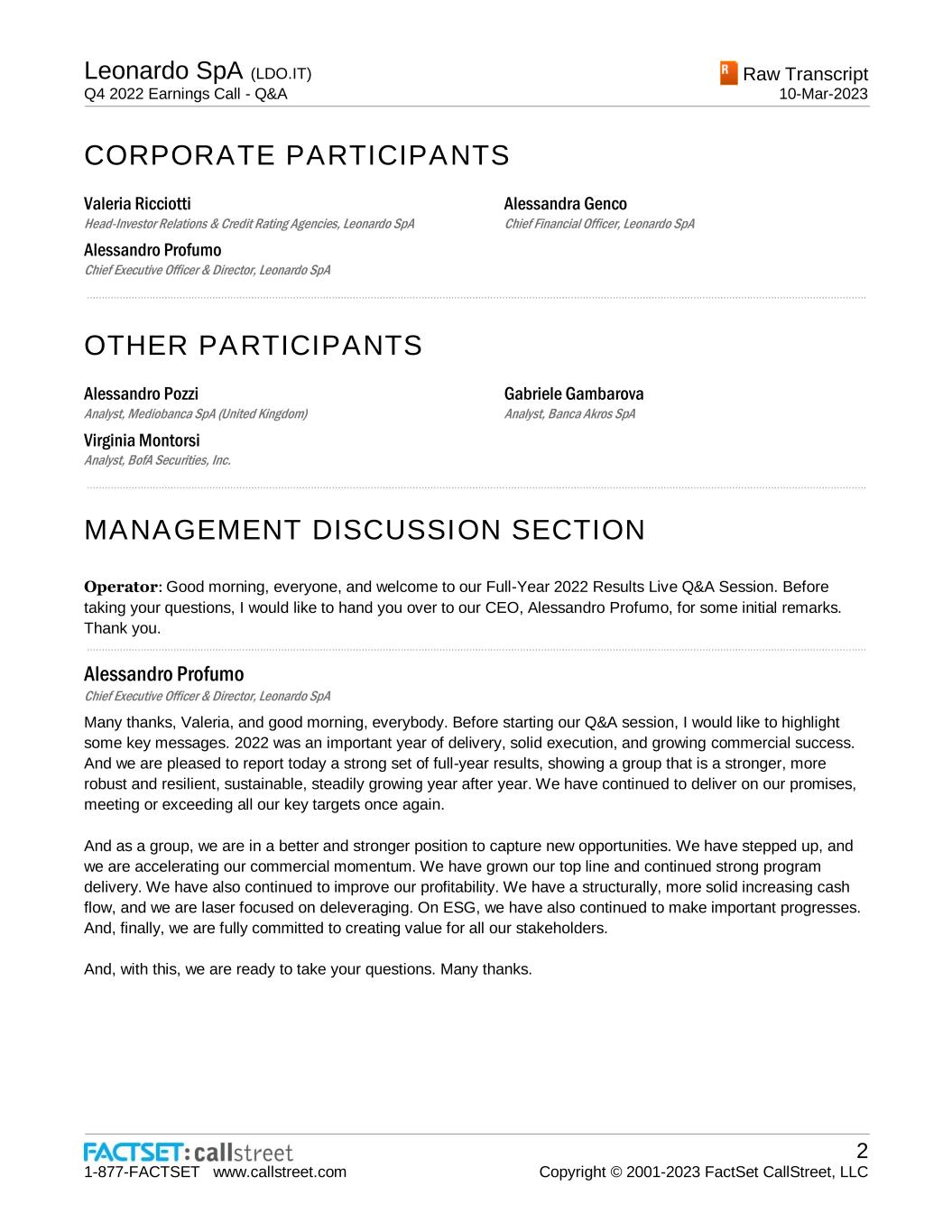 Leonardo SpA (LDO.IT) Q4 2022 Earnings Call - Q&A Raw Transcript 10-Mar-2023 1-877-FACTSET www.callstreet.com 2 Copyright © 2001-2023 FactSet CallStreet, LLC CORPORATE PARTICIPANTS Valeria Ricciotti Head-Investor Relations & Credit Rating Agencies, Leonardo SpA Alessandro Profumo Chief Executive Officer & Director, Leonardo SpA Alessandra Genco Chief Financial Officer, Leonardo SpA ..................................................................................................................................................................................................................................................................... OTHER PARTICIPANTS Alessandro Pozzi Analyst, Mediobanca SpA (United Kingdom) Virginia Montorsi Analyst, BofA Securities, Inc. Gabriele Gambarova Analyst, Banca Akros SpA ..................................................................................................................................................................................................................................................................... MANAGEMENT DISCUSSION SECTION Operator: Good morning, everyone, and welcome to our Full-Year 2022 Results Live Q&A Session. Before taking your questions, I would like to hand you over to our CEO, Alessandro Profumo, for some initial remarks. Thank you. ..................................................................................................................................................................................................................................................................... Alessandro Profumo Chief Executive Officer & Director, Leonardo SpA Many thanks, Valeria, and good morning, everybody. Before starting our Q&A session, I would like to highlight some key messages. 2022 was an important year of delivery, solid execution, and growing commercial success. And we are pleased to report today a strong set of full-year results, showing a group that is a stronger, more robust and resilient, sustainable, steadily growing year after year. We have continued to deliver on our promises, meeting or exceeding all our key targets once again. And as a group, we are in a better and stronger position to capture new opportunities. We have stepped up, and we are accelerating our commercial momentum. We have grown our top line and continued strong program delivery. We have also continued to improve our profitability. We have a structurally, more solid increasing cash flow, and we are laser focused on deleveraging. On ESG, we have also continued to make important progresses. And, finally, we are fully committed to creating value for all our stakeholders. And, with this, we are ready to take your questions. Many thanks.