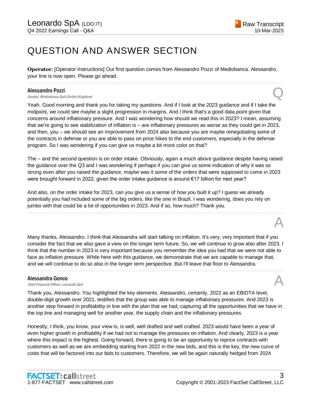 Leonardo SpA (LDO.IT) Q4 2022 Earnings Call - Q&A Raw Transcript 10-Mar-2023 1-877-FACTSET www.callstreet.com 3 Copyright © 2001-2023 FactSet CallStreet, LLC QUESTION AND ANSWER SECTION Operator: [Operator Instructions] Our first question comes from Alessandro Pozzi of Mediobanca. Alessandro, your line is now open. Please go ahead. ..................................................................................................................................................................................................................................................................... Alessandro Pozzi Analyst, Mediobanca SpA (United Kingdom) Q Yeah. Good morning and thank you for taking my questions. And if I look at the 2023 guidance and if I take the midpoint, we could see maybe a slight progression in margins. And I think that's a good data point given that concerns around inflationary pressure. And I was wondering how should we read this in 2023? I mean, assuming that we're going to see stabilization of inflation is – are inflationary pressures as worse as they could get in 2023, and then, you – we should see an improvement from 2024 also because you are maybe renegotiating some of the contracts in defense or you are able to pass on price hikes to the end customers, especially in the defense program. So I was wondering if you can give us maybe a bit more color on that? The – and the second question is on order intake. Obviously, again a much above guidance despite having raised the guidance over the Q3 and I was wondering if perhaps if you can give us some indication of why it was so strong even after you raised the guidance, maybe was it some of the orders that were supposed to come in 2023 were brought forward in 2022, given the order intake guidance is around €17 billion for next year? And also, on the order intake for 2023, can you give us a sense of how you built it up? I guess we already potentially you had included some of the big orders, like the one in Brazil. I was wondering, does you rely on jumbo with that could be a lot of opportunities in 2023. And if so, how much? Thank you. ..................................................................................................................................................................................................................................................................... A Many thanks, Alessandro. I think that Alessandra will start talking on inflation. It's very, very important that if you consider the fact that we also gave a view on the longer term future. So, we will continue to grow also after 2023. I think that the number in 2023 is very important because you remember the idea you had that we were not able to face as inflation pressure. While here with this guidance, we demonstrate that we are capable to manage that, and we will continue to do so also in the longer term perspective. But I'll leave that floor to Alessandra. ..................................................................................................................................................................................................................................................................... Alessandra Genco Chief Financial Officer, Leonardo SpA A Thank you, Alessandro. You highlighted the key elements. Alessandro, certainly, 2022 as an EBIDTA level, double-digit growth over 2021, testifies that the group was able to manage inflationary pressures. And 2023 is another step forward in profitability in line with the plan that we had, capturing all the opportunities that we have in the top line and managing well for another year, the supply chain and the inflationary pressures. Honestly, I think, you know, your view is, is well, well drafted and well crafted. 2023 would have been a year of even higher growth in profitability if we had not to manage the pressures on inflation. And clearly, 2023 is a year where this impact is the highest. Going forward, there is going to be an opportunity to reprice contracts with customers as well as we are embedding starting from 2022 in the new bids, and this is the key, the new curve of costs that will be factored into our bids to customers. Therefore, we will be again naturally hedged from 2024