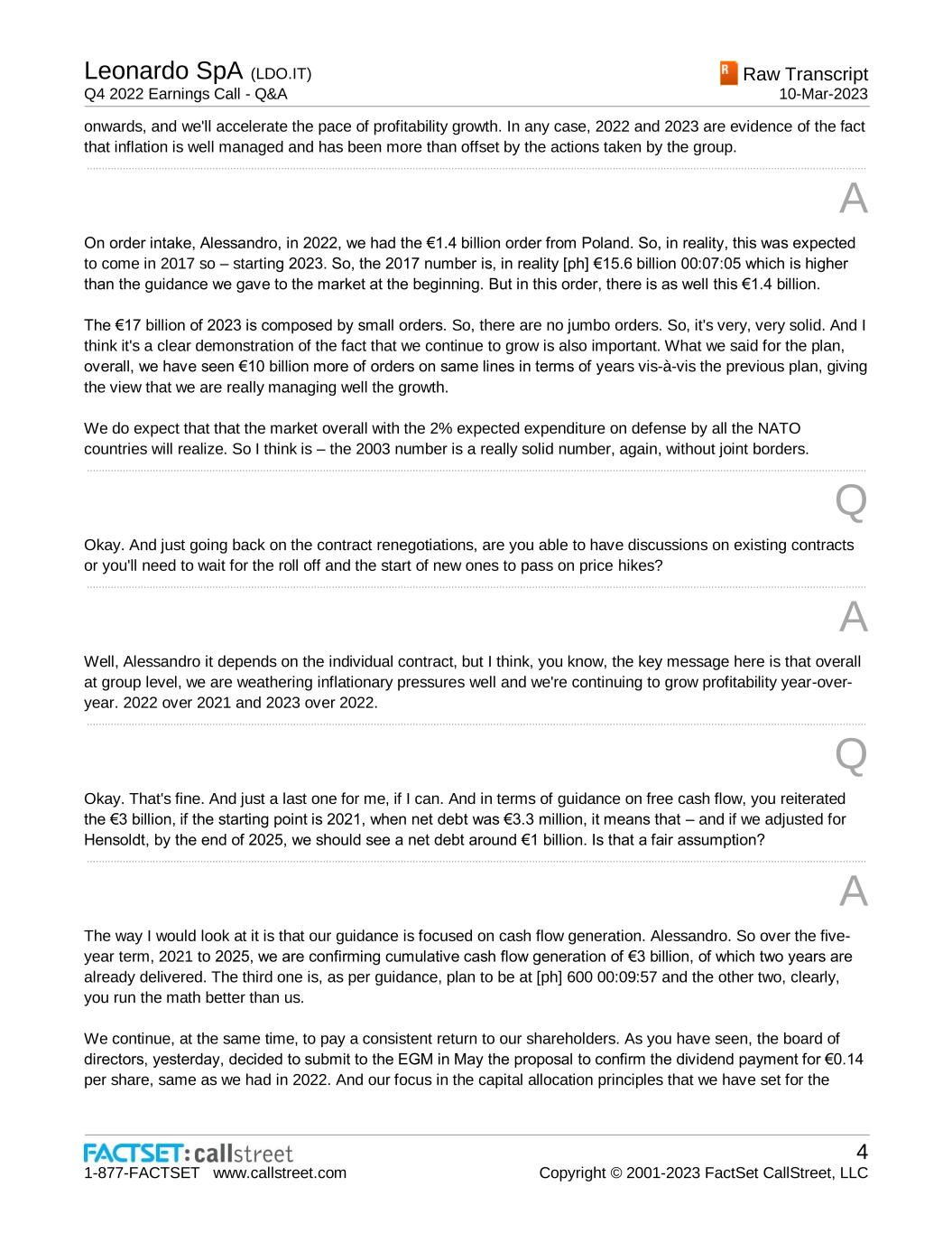 Leonardo SpA (LDO.IT) Q4 2022 Earnings Call - Q&A Raw Transcript 10-Mar-2023 1-877-FACTSET www.callstreet.com 4 Copyright © 2001-2023 FactSet CallStreet, LLC onwards, and we'll accelerate the pace of profitability growth. In any case, 2022 and 2023 are evidence of the fact that inflation is well managed and has been more than offset by the actions taken by the group. ..................................................................................................................................................................................................................................................................... A On order intake, Alessandro, in 2022, we had the €1.4 billion order from Poland. So, in reality, this was expected to come in 2017 so – starting 2023. So, the 2017 number is, in reality [ph] €15.6 billion 00:07:05 which is higher than the guidance we gave to the market at the beginning. But in this order, there is as well this €1.4 billion. The €17 billion of 2023 is composed by small orders. So, there are no jumbo orders. So, it's very, very solid. And I think it's a clear demonstration of the fact that we continue to grow is also important. What we said for the plan, overall, we have seen €10 billion more of orders on same lines in terms of years vis-à-vis the previous plan, giving the view that we are really managing well the growth. We do expect that that the market overall with the 2% expected expenditure on defense by all the NATO countries will realize. So I think is – the 2003 number is a really solid number, again, without joint borders. ..................................................................................................................................................................................................................................................................... Q Okay. And just going back on the contract renegotiations, are you able to have discussions on existing contracts or you'll need to wait for the roll off and the start of new ones to pass on price hikes? ..................................................................................................................................................................................................................................................................... A Well, Alessandro it depends on the individual contract, but I think, you know, the key message here is that overall at group level, we are weathering inflationary pressures well and we're continuing to grow profitability year-over- year. 2022 over 2021 and 2023 over 2022. ..................................................................................................................................................................................................................................................................... Q Okay. That's fine. And just a last one for me, if I can. And in terms of guidance on free cash flow, you reiterated the €3 billion, if the starting point is 2021, when net debt was €3.3 million, it means that – and if we adjusted for Hensoldt, by the end of 2025, we should see a net debt around €1 billion. Is that a fair assumption? ..................................................................................................................................................................................................................................................................... A The way I would look at it is that our guidance is focused on cash flow generation. Alessandro. So over the five- year term, 2021 to 2025, we are confirming cumulative cash flow generation of €3 billion, of which two years are already delivered. The third one is, as per guidance, plan to be at [ph] 600 00:09:57 and the other two, clearly, you run the math better than us. We continue, at the same time, to pay a consistent return to our shareholders. As you have seen, the board of directors, yesterday, decided to submit to the EGM in May the proposal to confirm the dividend payment for €0.14 per share, same as we had in 2022. And our focus in the capital allocation principles that we have set for the