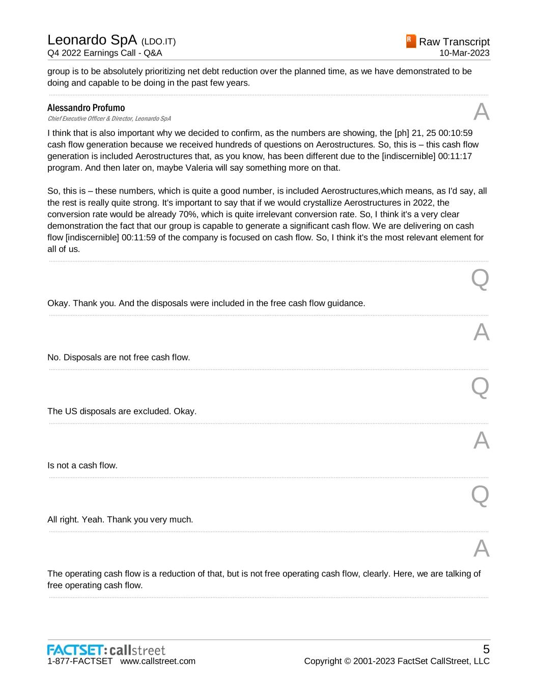 Leonardo SpA (LDO.IT) Q4 2022 Earnings Call - Q&A Raw Transcript 10-Mar-2023 1-877-FACTSET www.callstreet.com 5 Copyright © 2001-2023 FactSet CallStreet, LLC group is to be absolutely prioritizing net debt reduction over the planned time, as we have demonstrated to be doing and capable to be doing in the past few years. ..................................................................................................................................................................................................................................................................... Alessandro Profumo Chief Executive Officer & Director, Leonardo SpA A I think that is also important why we decided to confirm, as the numbers are showing, the [ph] 21, 25 00:10:59 cash flow generation because we received hundreds of questions on Aerostructures. So, this is – this cash flow generation is included Aerostructures that, as you know, has been different due to the [indiscernible] 00:11:17 program. And then later on, maybe Valeria will say something more on that. So, this is – these numbers, which is quite a good number, is included Aerostructures,which means, as I'd say, all the rest is really quite strong. It's important to say that if we would crystallize Aerostructures in 2022, the conversion rate would be already 70%, which is quite irrelevant conversion rate. So, I think it's a very clear demonstration the fact that our group is capable to generate a significant cash flow. We are delivering on cash flow [indiscernible] 00:11:59 of the company is focused on cash flow. So, I think it's the most relevant element for all of us. ..................................................................................................................................................................................................................................................................... Q Okay. Thank you. And the disposals were included in the free cash flow guidance. ..................................................................................................................................................................................................................................................................... A No. Disposals are not free cash flow. ..................................................................................................................................................................................................................................................................... Q The US disposals are excluded. Okay. ..................................................................................................................................................................................................................................................................... A Is not a cash flow. ..................................................................................................................................................................................................................................................................... Q All right. Yeah. Thank you very much. ..................................................................................................................................................................................................................................................................... A The operating cash flow is a reduction of that, but is not free operating cash flow, clearly. Here, we are talking of free operating cash flow. .....................................................................................................................................................................................................................................................................