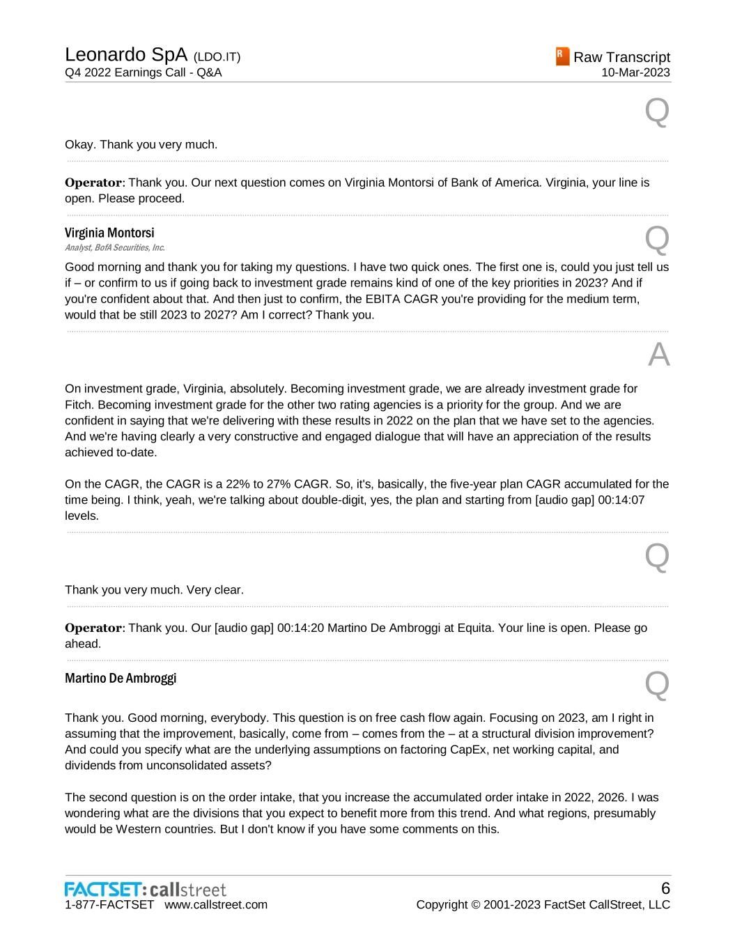 Leonardo SpA (LDO.IT) Q4 2022 Earnings Call - Q&A Raw Transcript 10-Mar-2023 1-877-FACTSET www.callstreet.com 6 Copyright © 2001-2023 FactSet CallStreet, LLC Q Okay. Thank you very much. ..................................................................................................................................................................................................................................................................... Operator: Thank you. Our next question comes on Virginia Montorsi of Bank of America. Virginia, your line is open. Please proceed. ..................................................................................................................................................................................................................................................................... Virginia Montorsi Analyst, BofA Securities, Inc. Q Good morning and thank you for taking my questions. I have two quick ones. The first one is, could you just tell us if – or confirm to us if going back to investment grade remains kind of one of the key priorities in 2023? And if you're confident about that. And then just to confirm, the EBITA CAGR you're providing for the medium term, would that be still 2023 to 2027? Am I correct? Thank you. ..................................................................................................................................................................................................................................................................... A On investment grade, Virginia, absolutely. Becoming investment grade, we are already investment grade for Fitch. Becoming investment grade for the other two rating agencies is a priority for the group. And we are confident in saying that we're delivering with these results in 2022 on the plan that we have set to the agencies. And we're having clearly a very constructive and engaged dialogue that will have an appreciation of the results achieved to-date. On the CAGR, the CAGR is a 22% to 27% CAGR. So, it's, basically, the five-year plan CAGR accumulated for the time being. I think, yeah, we're talking about double-digit, yes, the plan and starting from [audio gap] 00:14:07 levels. ..................................................................................................................................................................................................................................................................... Q Thank you very much. Very clear. ..................................................................................................................................................................................................................................................................... Operator: Thank you. Our [audio gap] 00:14:20 Martino De Ambroggi at Equita. Your line is open. Please go ahead. ..................................................................................................................................................................................................................................................................... Martino De Ambroggi Q Thank you. Good morning, everybody. This question is on free cash flow again. Focusing on 2023, am I right in assuming that the improvement, basically, come from – comes from the – at a structural division improvement? And could you specify what are the underlying assumptions on factoring CapEx, net working capital, and dividends from unconsolidated assets? The second question is on the order intake, that you increase the accumulated order intake in 2022, 2026. I was wondering what are the divisions that you expect to benefit more from this trend. And what regions, presumably would be Western countries. But I don't know if you have some comments on this.