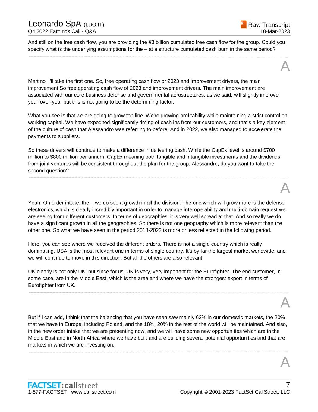 Leonardo SpA (LDO.IT) Q4 2022 Earnings Call - Q&A Raw Transcript 10-Mar-2023 1-877-FACTSET www.callstreet.com 7 Copyright © 2001-2023 FactSet CallStreet, LLC And still on the free cash flow, you are providing the €3 billion cumulated free cash flow for the group. Could you specify what is the underlying assumptions for the – at a structure cumulated cash burn in the same period? ..................................................................................................................................................................................................................................................................... A Martino, I'll take the first one. So, free operating cash flow or 2023 and improvement drivers, the main improvement So free operating cash flow of 2023 and improvement drivers. The main improvement are associated with our core business defense and governmental aerostructures, as we said, will slightly improve year-over-year but this is not going to be the determining factor. What you see is that we are going to grow top line. We're growing profitability while maintaining a strict control on working capital. We have expedited significantly timing of cash ins from our customers, and that's a key element of the culture of cash that Alessandro was referring to before. And in 2022, we also managed to accelerate the payments to suppliers. So these drivers will continue to make a difference in delivering cash. While the CapEx level is around $700 million to $800 million per annum, CapEx meaning both tangible and intangible investments and the dividends from joint ventures will be consistent throughout the plan for the group. Alessandro, do you want to take the second question? ..................................................................................................................................................................................................................................................................... A Yeah. On order intake, the – we do see a growth in all the division. The one which will grow more is the defense electronics, which is clearly incredibly important in order to manage interoperability and multi-domain request we are seeing from different customers. In terms of geographies, it is very well spread at that. And so really we do have a significant growth in all the geographies. So there is not one geography which is more relevant than the other one. So what we have seen in the period 2018-2022 is more or less reflected in the following period. Here, you can see where we received the different orders. There is not a single country which is really dominating. USA is the most relevant one in terms of single country. It's by far the largest market worldwide, and we will continue to move in this direction. But all the others are also relevant. UK clearly is not only UK, but since for us, UK is very, very important for the Eurofighter. The end customer, in some case, are in the Middle East, which is the area and where we have the strongest export in terms of Eurofighter from UK. ..................................................................................................................................................................................................................................................................... A But if I can add, I think that the balancing that you have seen saw mainly 62% in our domestic markets, the 20% that we have in Europe, including Poland, and the 18%, 20% in the rest of the world will be maintained. And also, in the new order intake that we are presenting now, and we will have some new opportunities which are in the Middle East and in North Africa where we have built and are building several potential opportunities and that are markets in which we are investing on. ..................................................................................................................................................................................................................................................................... A