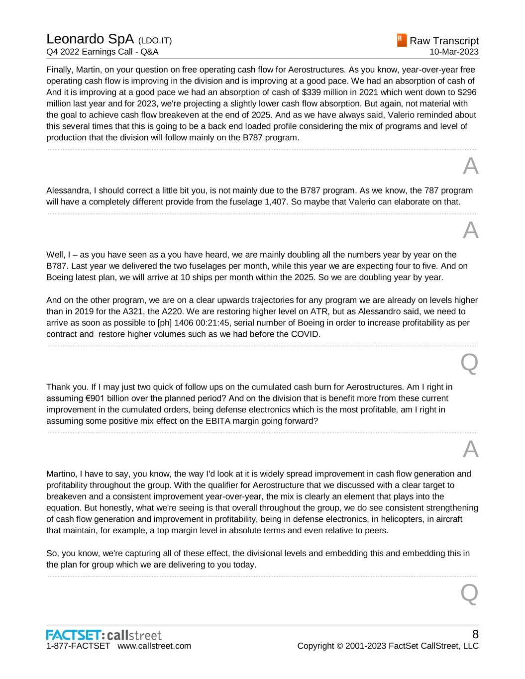 Leonardo SpA (LDO.IT) Q4 2022 Earnings Call - Q&A Raw Transcript 10-Mar-2023 1-877-FACTSET www.callstreet.com 8 Copyright © 2001-2023 FactSet CallStreet, LLC Finally, Martin, on your question on free operating cash flow for Aerostructures. As you know, year-over-year free operating cash flow is improving in the division and is improving at a good pace. We had an absorption of cash of And it is improving at a good pace we had an absorption of cash of $339 million in 2021 which went down to $296 million last year and for 2023, we're projecting a slightly lower cash flow absorption. But again, not material with the goal to achieve cash flow breakeven at the end of 2025. And as we have always said, Valerio reminded about this several times that this is going to be a back end loaded profile considering the mix of programs and level of production that the division will follow mainly on the B787 program. ..................................................................................................................................................................................................................................................................... A Alessandra, I should correct a little bit you, is not mainly due to the B787 program. As we know, the 787 program will have a completely different provide from the fuselage 1,407. So maybe that Valerio can elaborate on that. ..................................................................................................................................................................................................................................................................... A Well, I – as you have seen as a you have heard, we are mainly doubling all the numbers year by year on the B787. Last year we delivered the two fuselages per month, while this year we are expecting four to five. And on Boeing latest plan, we will arrive at 10 ships per month within the 2025. So we are doubling year by year. And on the other program, we are on a clear upwards trajectories for any program we are already on levels higher than in 2019 for the A321, the A220. We are restoring higher level on ATR, but as Alessandro said, we need to arrive as soon as possible to [ph] 1406 00:21:45, serial number of Boeing in order to increase profitability as per contract and restore higher volumes such as we had before the COVID. ..................................................................................................................................................................................................................................................................... Q Thank you. If I may just two quick of follow ups on the cumulated cash burn for Aerostructures. Am I right in assuming €901 billion over the planned period? And on the division that is benefit more from these current improvement in the cumulated orders, being defense electronics which is the most profitable, am I right in assuming some positive mix effect on the EBITA margin going forward? ..................................................................................................................................................................................................................................................................... A Martino, I have to say, you know, the way I'd look at it is widely spread improvement in cash flow generation and profitability throughout the group. With the qualifier for Aerostructure that we discussed with a clear target to breakeven and a consistent improvement year-over-year, the mix is clearly an element that plays into the equation. But honestly, what we're seeing is that overall throughout the group, we do see consistent strengthening of cash flow generation and improvement in profitability, being in defense electronics, in helicopters, in aircraft that maintain, for example, a top margin level in absolute terms and even relative to peers. So, you know, we're capturing all of these effect, the divisional levels and embedding this and embedding this in the plan for group which we are delivering to you today. ..................................................................................................................................................................................................................................................................... Q