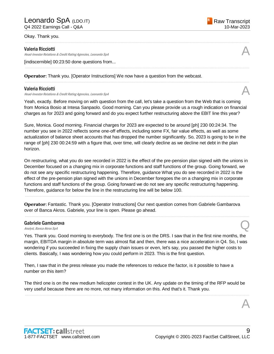 Leonardo SpA (LDO.IT) Q4 2022 Earnings Call - Q&A Raw Transcript 10-Mar-2023 1-877-FACTSET www.callstreet.com 9 Copyright © 2001-2023 FactSet CallStreet, LLC Okay. Thank you. ..................................................................................................................................................................................................................................................................... Valeria Ricciotti Head-Investor Relations & Credit Rating Agencies, Leonardo SpA A [indiscernible] 00:23:50 done questions from... ..................................................................................................................................................................................................................................................................... Operator: Thank you. [Operator Instructions] We now have a question from the webcast. ..................................................................................................................................................................................................................................................................... Valeria Ricciotti Head-Investor Relations & Credit Rating Agencies, Leonardo SpA A Yeah, exactly. Before moving on with question from the call, let's take a question from the Web that is coming from Monica Bosio at Intesa Sanpaolo. Good morning. Can you please provide us a rough indication on financial charges as for 2023 and going forward and do you expect further restructuring above the EBIT line this year? Sure, Monica. Good morning. Financial charges for 2023 are expected to be around [ph] 230 00:24:34. The number you see in 2022 reflects some one-off effects, including some FX, fair value effects, as well as some actualization of balance sheet accounts that has dropped the number significantly. So, 2023 is going to be in the range of [ph] 230 00:24:59 with a figure that, over time, will clearly decline as we decline net debt in the plan horizon. On restructuring, what you do see recorded in 2022 is the effect of the pre-pension plan signed with the unions in December focused on a changing mix in corporate functions and staff functions of the group. Going forward, we do not see any specific restructuring happening. Therefore, guidance What you do see recorded in 2022 is the effect of the pre-pension plan signed with the unions in December foregoes the on a changing mix in corporate functions and staff functions of the group. Going forward we do not see any specific restructuring happening. Therefore, guidance for below the line in the restructuring line will be below 100. ..................................................................................................................................................................................................................................................................... Operator: Fantastic. Thank you. [Operator Instructions] Our next question comes from Gabriele Gambarova over of Banca Akros. Gabriele, your line is open. Please go ahead. ..................................................................................................................................................................................................................................................................... Gabriele Gambarova Analyst, Banca Akros SpA Q Yes. Thank you. Good morning to everybody. The first one is on the DRS. I saw that in the first nine months, the margin, EBITDA margin in absolute term was almost flat and then, there was a nice acceleration in Q4. So, I was wondering if you succeeded in fixing the supply chain issues or even, let's say, you passed the higher costs to clients. Basically, I was wondering how you could perform in 2023. This is the first question. Then, I saw that in the press release you made the references to reduce the factor, is it possible to have a number on this item? The third one is on the new medium helicopter contest in the UK. Any update on the timing of the RFP would be very useful because there are no more, not many information on this. And that's it. Thank you. ..................................................................................................................................................................................................................................................................... A