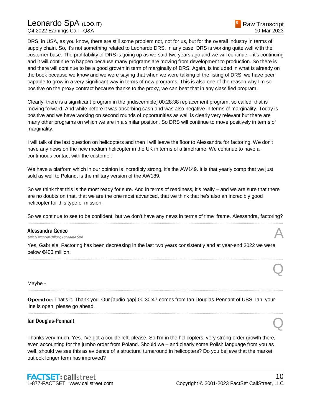 Leonardo SpA (LDO.IT) Q4 2022 Earnings Call - Q&A Raw Transcript 10-Mar-2023 1-877-FACTSET www.callstreet.com 10 Copyright © 2001-2023 FactSet CallStreet, LLC DRS, in USA, as you know, there are still some problem not, not for us, but for the overall industry in terms of supply chain. So, it's not something related to Leonardo DRS. In any case, DRS is working quite well with the customer base. The profitability of DRS is going up as we said two years ago and we will continue – it's continuing and it will continue to happen because many programs are moving from development to production. So there is and there will continue to be a good growth in term of marginally of DRS. Again, is included in what is already on the book because we know and we were saying that when we were talking of the listing of DRS, we have been capable to grow in a very significant way in terms of new programs. This is also one of the reason why I'm so positive on the proxy contract because thanks to the proxy, we can beat that in any classified program. Clearly, there is a significant program in the [indiscernible] 00:28:38 replacement program, so called, that is moving forward. And while before it was absorbing cash and was also negative in terms of marginality. Today is positive and we have working on second rounds of opportunities as well is clearly very relevant but there are many other programs on which we are in a similar position. So DRS will continue to move positively in terms of marginality. I will talk of the last question on helicopters and then I will leave the floor to Alessandra for factoring. We don't have any news on the new medium helicopter in the UK in terms of a timeframe. We continue to have a continuous contact with the customer. We have a platform which in our opinion is incredibly strong, it's the AW149. It is that yearly comp that we just sold as well to Poland, is the military version of the AW189. So we think that this is the most ready for sure. And in terms of readiness, it's really – and we are sure that there are no doubts on that, that we are the one most advanced, that we think that he's also an incredibly good helicopter for this type of mission. So we continue to see to be confident, but we don't have any news in terms of time frame. Alessandra, factoring? ..................................................................................................................................................................................................................................................................... Alessandra Genco Chief Financial Officer, Leonardo SpA A Yes, Gabriele. Factoring has been decreasing in the last two years consistently and at year-end 2022 we were below €400 million. ..................................................................................................................................................................................................................................................................... Q Maybe - ..................................................................................................................................................................................................................................................................... Operator: That's it. Thank you. Our [audio gap] 00:30:47 comes from Ian Douglas-Pennant of UBS. Ian, your line is open, please go ahead. ..................................................................................................................................................................................................................................................................... Ian Douglas-Pennant Q Thanks very much. Yes, I've got a couple left, please. So I'm in the helicopters, very strong order growth there, even accounting for the jumbo order from Poland. Should we – and clearly some Polish language from you as well, should we see this as evidence of a structural turnaround in helicopters? Do you believe that the market outlook longer term has improved?