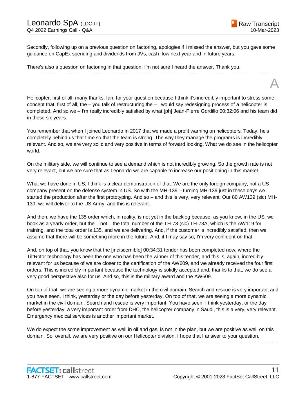 Leonardo SpA (LDO.IT) Q4 2022 Earnings Call - Q&A Raw Transcript 10-Mar-2023 1-877-FACTSET www.callstreet.com 11 Copyright © 2001-2023 FactSet CallStreet, LLC Secondly, following up on a previous question on factoring, apologies if I missed the answer, but you gave some guidance on CapEx spending and dividends from JVs, cash flow next year and in future years. There's also a question on factoring in that question, I'm not sure I heard the answer. Thank you. ..................................................................................................................................................................................................................................................................... A Helicopter, first of all, many thanks, Ian, for your question because I think it's incredibly important to stress some concept that, first of all, the – you talk of restructuring the – I would say redesigning process of a helicopter is completed. And so we – I'm really incredibly satisfied by what [ph] Jean-Pierre Gordillo 00:32:06 and his team did in these six years. You remember that when I joined Leonardo in 2017 that we made a profit warning on helicopters. Today, he's completely behind us that time so that the team is strong. The way they manage the programs is incredibly relevant. And so, we are very solid and very positive in terms of forward looking. What we do see in the helicopter world. On the military side, we will continue to see a demand which is not incredibly growing. So the growth rate is not very relevant, but we are sure that as Leonardo we are capable to increase our positioning in this market. What we have done in US, I think is a clear demonstration of that. We are the only foreign company, not a US company present on the defense system in US. So with the MH-139 – turning MH-139 just in these days we started the production after the first prototyping. And so – and this is very, very relevant. Our 80 AW139 (sic) MH- 139, we will deliver to the US Army, and this is relevant. And then, we have the 135 order which, in reality, is not yet in the backlog because, as you know, in the US, we book as a yearly order, but the – not – the total number of the TH-73 (sic) TH-73A, which is the AW119 for training, and the total order is 135, and we are delivering. And, if the customer is incredibly satisfied, then we assume that there will be something more in the future. And, if I may say so, I'm very confident on that. And, on top of that, you know that the [indiscernible] 00:34:31 tender has been completed now, where the TiltRotor technology has been the one who has been the winner of this tender, and this is, again, incredibly relevant for us because of we are closer to the certification of the AW609, and we already received the four first orders. This is incredibly important because the technology is solidly accepted and, thanks to that, we do see a very good perspective also for us. And so, this is the military award and the AW609. On top of that, we are seeing a more dynamic market in the civil domain. Search and rescue is very important and you have seen, I think, yesterday or the day before yesterday, On top of that, we are seeing a more dynamic market in the civil domain. Search and rescue is very important. You have seen, I think yesterday, or the day before yesterday, a very important order from DHC, the helicopter company in Saudi, this is a very, very relevant. Emergency medical services is another important market. We do expect the some improvement as well in oil and gas, is not in the plan, but we are positive as well on this domain. So, overall, we are very positive on our Helicopter division. I hope that I answer to your question. .....................................................................................................................................................................................................................................................................