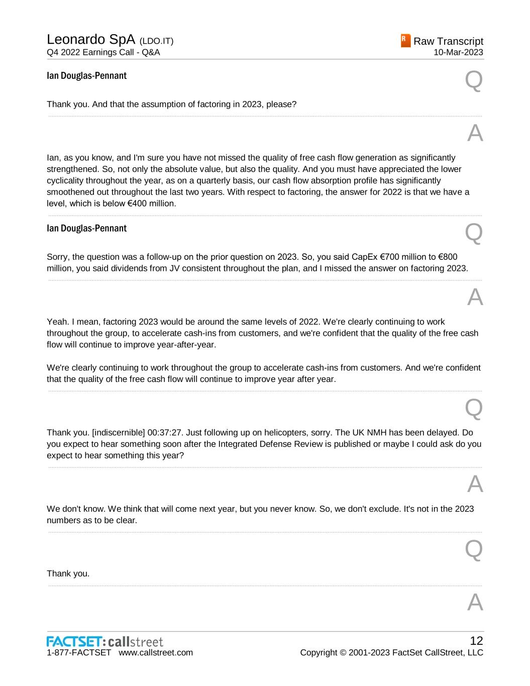 Leonardo SpA (LDO.IT) Q4 2022 Earnings Call - Q&A Raw Transcript 10-Mar-2023 1-877-FACTSET www.callstreet.com 12 Copyright © 2001-2023 FactSet CallStreet, LLC Ian Douglas-Pennant Q Thank you. And that the assumption of factoring in 2023, please? ..................................................................................................................................................................................................................................................................... A Ian, as you know, and I'm sure you have not missed the quality of free cash flow generation as significantly strengthened. So, not only the absolute value, but also the quality. And you must have appreciated the lower cyclicality throughout the year, as on a quarterly basis, our cash flow absorption profile has significantly smoothened out throughout the last two years. With respect to factoring, the answer for 2022 is that we have a level, which is below €400 million. ..................................................................................................................................................................................................................................................................... Ian Douglas-Pennant Q Sorry, the question was a follow-up on the prior question on 2023. So, you said CapEx €700 million to €800 million, you said dividends from JV consistent throughout the plan, and I missed the answer on factoring 2023. ..................................................................................................................................................................................................................................................................... A Yeah. I mean, factoring 2023 would be around the same levels of 2022. We're clearly continuing to work throughout the group, to accelerate cash-ins from customers, and we're confident that the quality of the free cash flow will continue to improve year-after-year. We're clearly continuing to work throughout the group to accelerate cash-ins from customers. And we're confident that the quality of the free cash flow will continue to improve year after year. ..................................................................................................................................................................................................................................................................... Q Thank you. [indiscernible] 00:37:27. Just following up on helicopters, sorry. The UK NMH has been delayed. Do you expect to hear something soon after the Integrated Defense Review is published or maybe I could ask do you expect to hear something this year? ..................................................................................................................................................................................................................................................................... A We don't know. We think that will come next year, but you never know. So, we don't exclude. It's not in the 2023 numbers as to be clear. ..................................................................................................................................................................................................................................................................... Q Thank you. ..................................................................................................................................................................................................................................................................... A