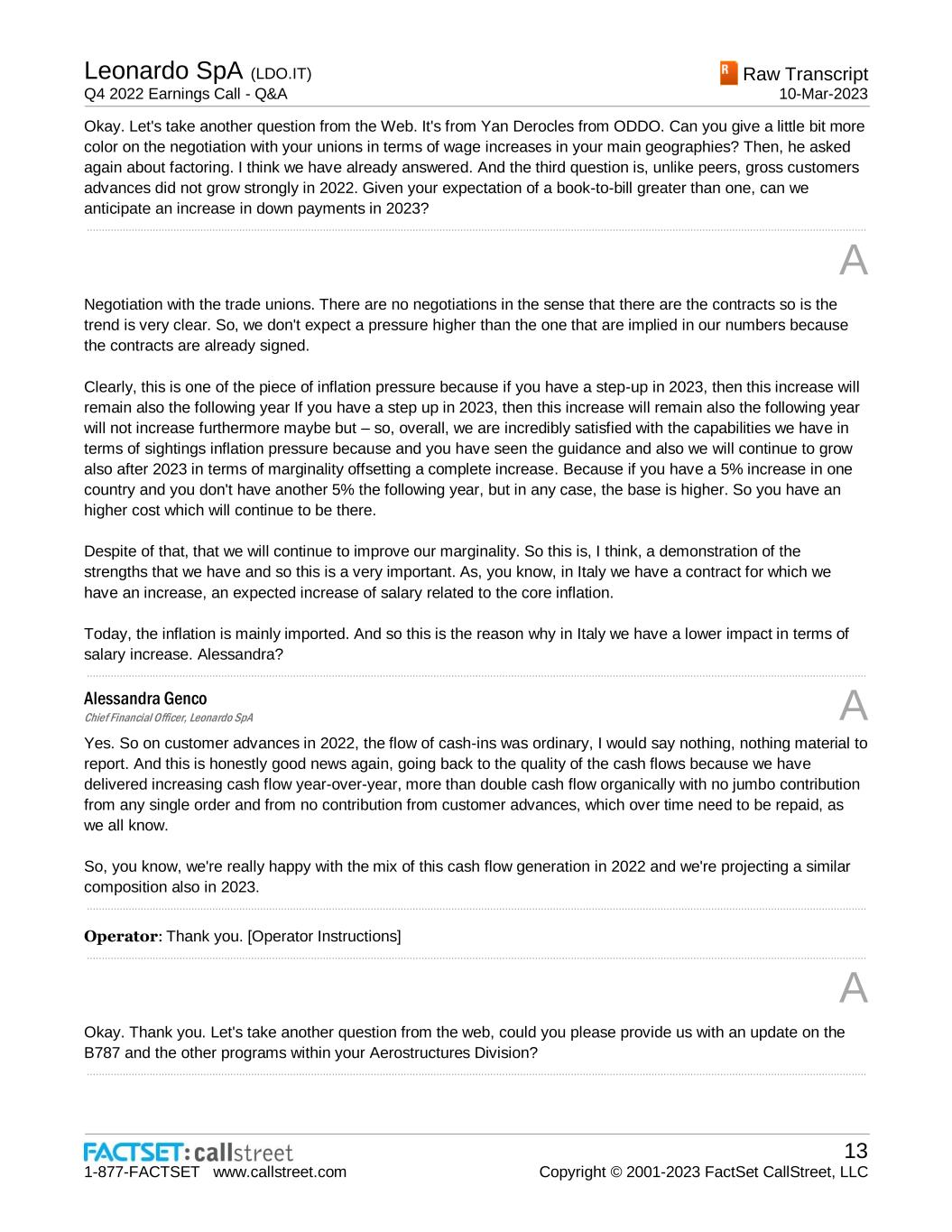 Leonardo SpA (LDO.IT) Q4 2022 Earnings Call - Q&A Raw Transcript 10-Mar-2023 1-877-FACTSET www.callstreet.com 13 Copyright © 2001-2023 FactSet CallStreet, LLC Okay. Let's take another question from the Web. It's from Yan Derocles from ODDO. Can you give a little bit more color on the negotiation with your unions in terms of wage increases in your main geographies? Then, he asked again about factoring. I think we have already answered. And the third question is, unlike peers, gross customers advances did not grow strongly in 2022. Given your expectation of a book-to-bill greater than one, can we anticipate an increase in down payments in 2023? ..................................................................................................................................................................................................................................................................... A Negotiation with the trade unions. There are no negotiations in the sense that there are the contracts so is the trend is very clear. So, we don't expect a pressure higher than the one that are implied in our numbers because the contracts are already signed. Clearly, this is one of the piece of inflation pressure because if you have a step-up in 2023, then this increase will remain also the following year If you have a step up in 2023, then this increase will remain also the following year will not increase furthermore maybe but – so, overall, we are incredibly satisfied with the capabilities we have in terms of sightings inflation pressure because and you have seen the guidance and also we will continue to grow also after 2023 in terms of marginality offsetting a complete increase. Because if you have a 5% increase in one country and you don't have another 5% the following year, but in any case, the base is higher. So you have an higher cost which will continue to be there. Despite of that, that we will continue to improve our marginality. So this is, I think, a demonstration of the strengths that we have and so this is a very important. As, you know, in Italy we have a contract for which we have an increase, an expected increase of salary related to the core inflation. Today, the inflation is mainly imported. And so this is the reason why in Italy we have a lower impact in terms of salary increase. Alessandra? ..................................................................................................................................................................................................................................................................... Alessandra Genco Chief Financial Officer, Leonardo SpA A Yes. So on customer advances in 2022, the flow of cash-ins was ordinary, I would say nothing, nothing material to report. And this is honestly good news again, going back to the quality of the cash flows because we have delivered increasing cash flow year-over-year, more than double cash flow organically with no jumbo contribution from any single order and from no contribution from customer advances, which over time need to be repaid, as we all know. So, you know, we're really happy with the mix of this cash flow generation in 2022 and we're projecting a similar composition also in 2023. ..................................................................................................................................................................................................................................................................... Operator: Thank you. [Operator Instructions] ..................................................................................................................................................................................................................................................................... A Okay. Thank you. Let's take another question from the web, could you please provide us with an update on the B787 and the other programs within your Aerostructures Division? .....................................................................................................................................................................................................................................................................