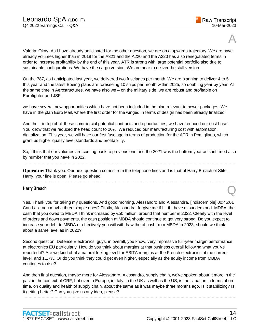 Leonardo SpA (LDO.IT) Q4 2022 Earnings Call - Q&A Raw Transcript 10-Mar-2023 1-877-FACTSET www.callstreet.com 14 Copyright © 2001-2023 FactSet CallStreet, LLC A Valeria. Okay. As I have already anticipated for the other question, we are on a upwards trajectory. We are have already volumes higher than in 2019 for the A321 and the A220 and the A220 has also renegotiated terms in order to increase profitability by the end of this year. ATR is strong with large potential portfolio also due to sustainable configurations. We have the cargo version. We are near to deliver the stall version. On the 787, as I anticipated last year, we delivered two fuselages per month. We are planning to deliver 4 to 5 this year and the latest Boeing plans are foreseeing 10 ships per month within 2025, so doubling year by year. At the same time in Aerostructures, we have also we – on the military side, we are robust and profitable on Eurofighter and JSF. we have several new opportunities which have not been included in the plan relevant to newer packages. We have in the plan Euro Mail, where the first order for the winged in terms of design has been already finalized. And the – in top of all these commercial potential contracts and opportunities, we have reduced our cost base. You know that we reduced the head count to 20%. We reduced our manufacturing cost with automation, digitalization. This year, we will have our first fuselage in terms of production for the ATR in Pomigliano, which grant us higher quality level standards and profitability. So, I think that our volumes are coming back to previous one and the 2021 was the bottom year as confirmed also by number that you have in 2022. ..................................................................................................................................................................................................................................................................... Operator: Thank you. Our next question comes from the telephone lines and is that of Harry Breach of Stifel. Harry, your line is open. Please go ahead. ..................................................................................................................................................................................................................................................................... Harry Breach Q Yes. Thank you for taking my questions. And good morning, Alessandro and Alessandra. [indiscernible] 00:45:01 Can I ask you maybe three simple ones? Firstly, Alessandra, forgive me if I – if I have misunderstood. MDBA, the cash that you owed to MBDA I think increased by €50 million, around that number in 2022. Clearly with the level of orders and down payments, the cash position at MBDA should continue to get very strong. Do you expect to increase your debt to MBDA or effectively you will withdraw the of cash from MBDA in 2023, should we think about a same level as in 2022? Second question, Defense Electronics, guys, in overall, you know, very impressive full-year margin performance at electronics EU particularly. How do you think about margins at that business overall following what you've reported it? Are we kind of at a natural feeling level for EBITA margins at the French electronics at the current level, and 11.7%. Or do you think they could get even higher, especially as the equity income from MBDA continues to rise? And then final question, maybe more for Alessandro. Alessandro, supply chain, we've spoken about it more in the past in the context of CRF, but over in Europe, in Italy, in the UK as well as the US, is the situation in terms of on time, on quality and health of supply chain, about the same as it was maybe three months ago. Is it stabilizing? Is it getting better? Can you give us any idea, please? .....................................................................................................................................................................................................................................................................