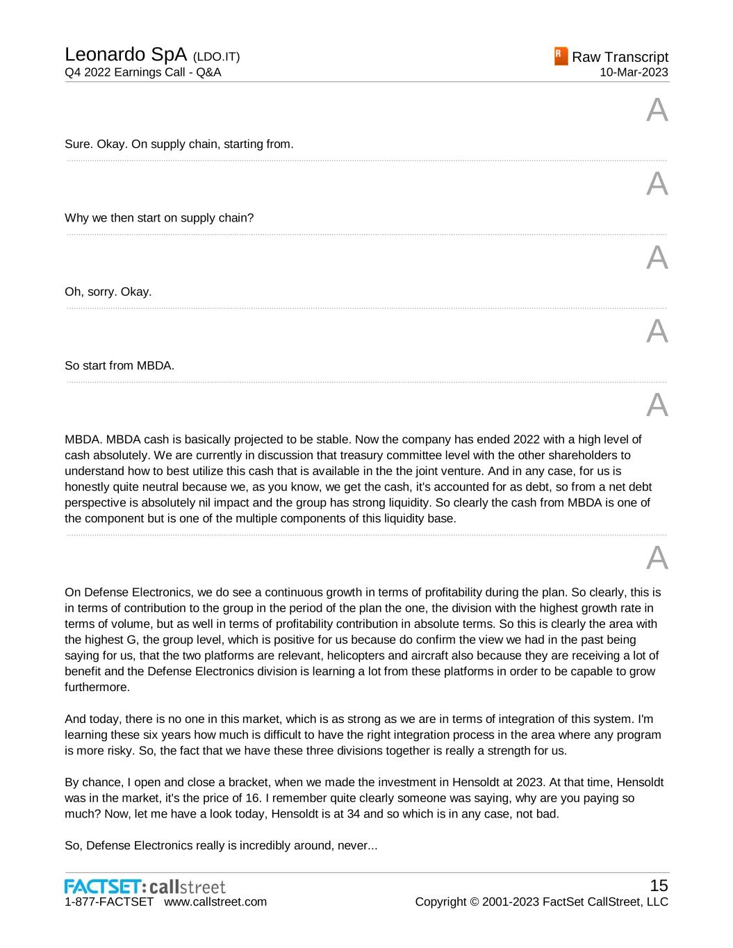 Leonardo SpA (LDO.IT) Q4 2022 Earnings Call - Q&A Raw Transcript 10-Mar-2023 1-877-FACTSET www.callstreet.com 15 Copyright © 2001-2023 FactSet CallStreet, LLC A Sure. Okay. On supply chain, starting from. ..................................................................................................................................................................................................................................................................... A Why we then start on supply chain? ..................................................................................................................................................................................................................................................................... A Oh, sorry. Okay. ..................................................................................................................................................................................................................................................................... A So start from MBDA. ..................................................................................................................................................................................................................................................................... A MBDA. MBDA cash is basically projected to be stable. Now the company has ended 2022 with a high level of cash absolutely. We are currently in discussion that treasury committee level with the other shareholders to understand how to best utilize this cash that is available in the the joint venture. And in any case, for us is honestly quite neutral because we, as you know, we get the cash, it's accounted for as debt, so from a net debt perspective is absolutely nil impact and the group has strong liquidity. So clearly the cash from MBDA is one of the component but is one of the multiple components of this liquidity base. ..................................................................................................................................................................................................................................................................... A On Defense Electronics, we do see a continuous growth in terms of profitability during the plan. So clearly, this is in terms of contribution to the group in the period of the plan the one, the division with the highest growth rate in terms of volume, but as well in terms of profitability contribution in absolute terms. So this is clearly the area with the highest G, the group level, which is positive for us because do confirm the view we had in the past being saying for us, that the two platforms are relevant, helicopters and aircraft also because they are receiving a lot of benefit and the Defense Electronics division is learning a lot from these platforms in order to be capable to grow furthermore. And today, there is no one in this market, which is as strong as we are in terms of integration of this system. I'm learning these six years how much is difficult to have the right integration process in the area where any program is more risky. So, the fact that we have these three divisions together is really a strength for us. By chance, I open and close a bracket, when we made the investment in Hensoldt at 2023. At that time, Hensoldt was in the market, it's the price of 16. I remember quite clearly someone was saying, why are you paying so much? Now, let me have a look today, Hensoldt is at 34 and so which is in any case, not bad. So, Defense Electronics really is incredibly around, never...
