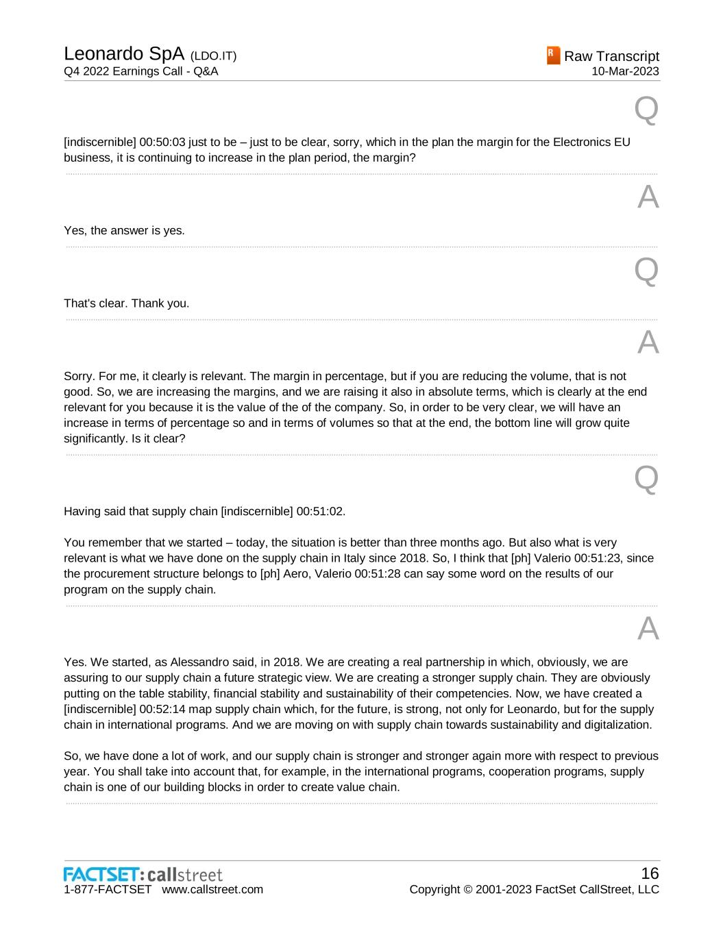 Leonardo SpA (LDO.IT) Q4 2022 Earnings Call - Q&A Raw Transcript 10-Mar-2023 1-877-FACTSET www.callstreet.com 16 Copyright © 2001-2023 FactSet CallStreet, LLC Q [indiscernible] 00:50:03 just to be – just to be clear, sorry, which in the plan the margin for the Electronics EU business, it is continuing to increase in the plan period, the margin? ..................................................................................................................................................................................................................................................................... A Yes, the answer is yes. ..................................................................................................................................................................................................................................................................... Q That's clear. Thank you. ..................................................................................................................................................................................................................................................................... A Sorry. For me, it clearly is relevant. The margin in percentage, but if you are reducing the volume, that is not good. So, we are increasing the margins, and we are raising it also in absolute terms, which is clearly at the end relevant for you because it is the value of the of the company. So, in order to be very clear, we will have an increase in terms of percentage so and in terms of volumes so that at the end, the bottom line will grow quite significantly. Is it clear? ..................................................................................................................................................................................................................................................................... Q Having said that supply chain [indiscernible] 00:51:02. You remember that we started – today, the situation is better than three months ago. But also what is very relevant is what we have done on the supply chain in Italy since 2018. So, I think that [ph] Valerio 00:51:23, since the procurement structure belongs to [ph] Aero, Valerio 00:51:28 can say some word on the results of our program on the supply chain. ..................................................................................................................................................................................................................................................................... A Yes. We started, as Alessandro said, in 2018. We are creating a real partnership in which, obviously, we are assuring to our supply chain a future strategic view. We are creating a stronger supply chain. They are obviously putting on the table stability, financial stability and sustainability of their competencies. Now, we have created a [indiscernible] 00:52:14 map supply chain which, for the future, is strong, not only for Leonardo, but for the supply chain in international programs. And we are moving on with supply chain towards sustainability and digitalization. So, we have done a lot of work, and our supply chain is stronger and stronger again more with respect to previous year. You shall take into account that, for example, in the international programs, cooperation programs, supply chain is one of our building blocks in order to create value chain. .....................................................................................................................................................................................................................................................................