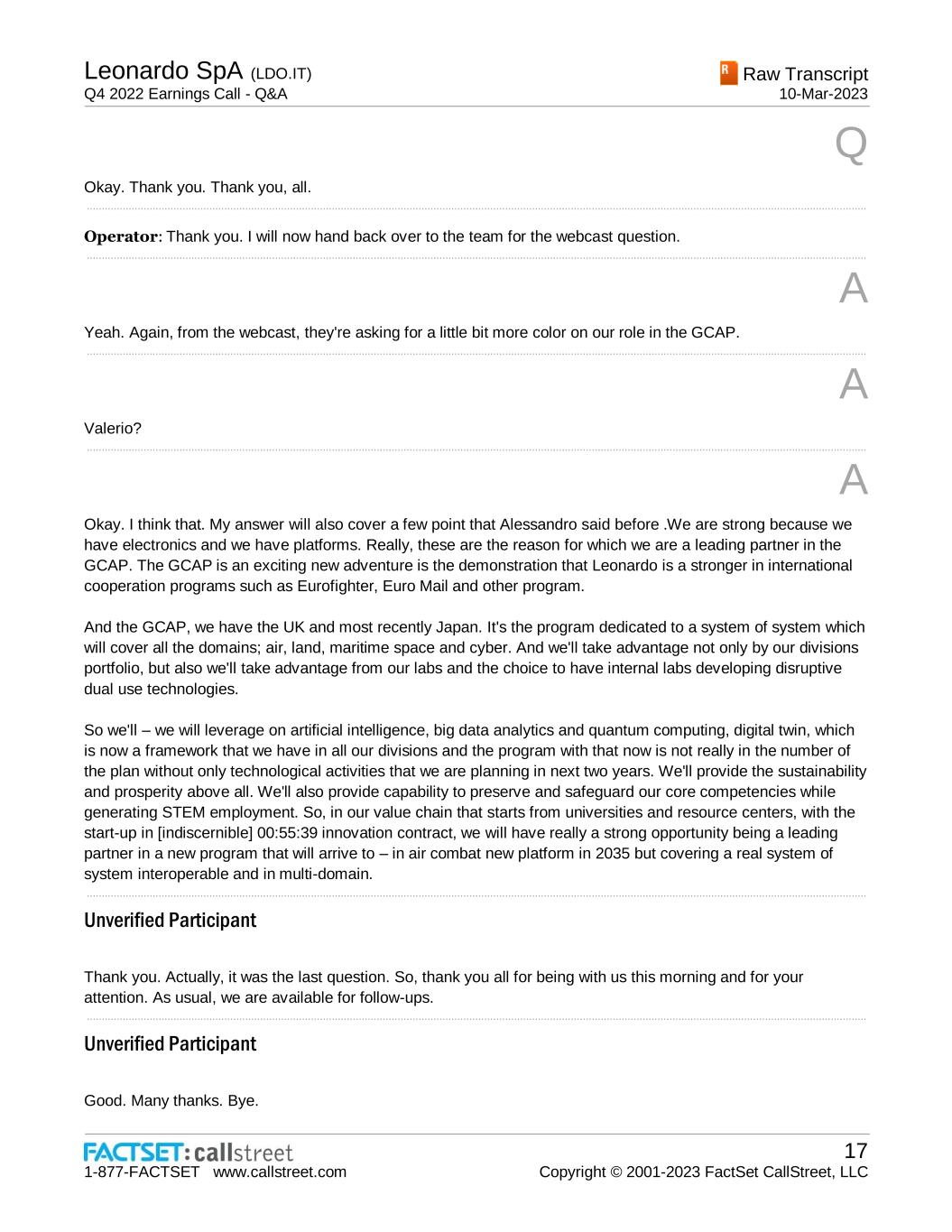 Leonardo SpA (LDO.IT) Q4 2022 Earnings Call - Q&A Raw Transcript 10-Mar-2023 1-877-FACTSET www.callstreet.com 17 Copyright © 2001-2023 FactSet CallStreet, LLC Q Okay. Thank you. Thank you, all. ..................................................................................................................................................................................................................................................................... Operator: Thank you. I will now hand back over to the team for the webcast question. ..................................................................................................................................................................................................................................................................... A Yeah. Again, from the webcast, they're asking for a little bit more color on our role in the GCAP. ..................................................................................................................................................................................................................................................................... A Valerio? ..................................................................................................................................................................................................................................................................... A Okay. I think that. My answer will also cover a few point that Alessandro said before .We are strong because we have electronics and we have platforms. Really, these are the reason for which we are a leading partner in the GCAP. The GCAP is an exciting new adventure is the demonstration that Leonardo is a stronger in international cooperation programs such as Eurofighter, Euro Mail and other program. And the GCAP, we have the UK and most recently Japan. It's the program dedicated to a system of system which will cover all the domains; air, land, maritime space and cyber. And we'll take advantage not only by our divisions portfolio, but also we'll take advantage from our labs and the choice to have internal labs developing disruptive dual use technologies. So we'll – we will leverage on artificial intelligence, big data analytics and quantum computing, digital twin, which is now a framework that we have in all our divisions and the program with that now is not really in the number of the plan without only technological activities that we are planning in next two years. We'll provide the sustainability and prosperity above all. We'll also provide capability to preserve and safeguard our core competencies while generating STEM employment. So, in our value chain that starts from universities and resource centers, with the start-up in [indiscernible] 00:55:39 innovation contract, we will have really a strong opportunity being a leading partner in a new program that will arrive to – in air combat new platform in 2035 but covering a real system of system interoperable and in multi-domain. ..................................................................................................................................................................................................................................................................... Unverified Participant Thank you. Actually, it was the last question. So, thank you all for being with us this morning and for your attention. As usual, we are available for follow-ups. ..................................................................................................................................................................................................................................................................... Unverified Participant Good. Many thanks. Bye.