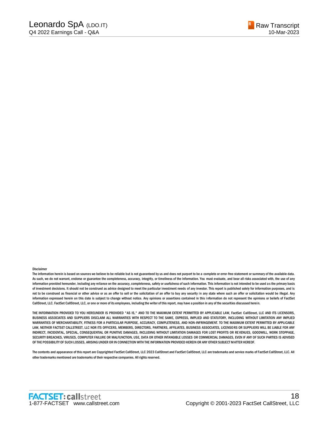 Raw Transcript 1-877-FACTSET www.callstreet.com Total Pages: 18 Copyright © 2001-2023 FactSet CallStreet, LLC 10-Mar-2023 Leonardo SpA (LDO.IT) Q4 2022 Earnings Call - Q&A
