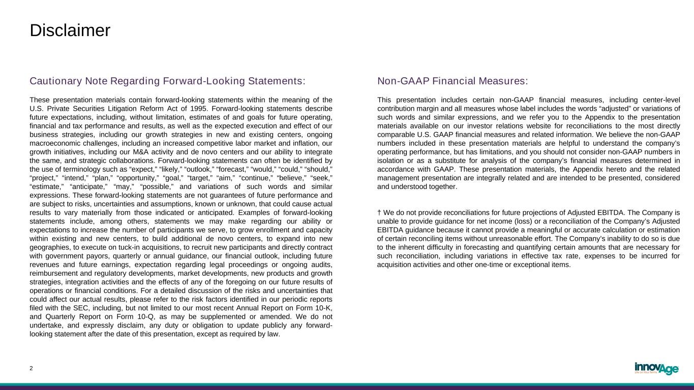 Disclaimer Cautionary Note Regarding Forward-Looking Statements: These presentation materials contain forward-looking statements within the meaning of the U.S. Private Securities Litigation Reform Act of 1995. Forward-looking statements describe future expectations, including, without limitation, estimates of and goals for future operating, financial and tax performance and results, as well as the expected execution and effect of our business strategies, including our growth strategies in new and existing centers, ongoing macroeconomic challenges, including an increased competitive labor market and inflation, our growth initiatives, including our M&A activity and de novo centers and our ability to integrate the same, and strategic collaborations. Forward-looking statements can often be identified by the use of terminology such as “expect,” “likely,” “outlook,” “forecast,” “would,” “could,” “should,” “project,” “intend,” “plan,” “opportunity,” “goal,” “target,” “aim,” “continue,” “believe,” “seek,” “estimate,” “anticipate,” “may,” “possible,” and variations of such words and similar expressions. These forward-looking statements are not guarantees of future performance and are subject to risks, uncertainties and assumptions, known or unknown, that could cause actual results to vary materially from those indicated or anticipated. Examples of forward-looking statements include, among others, statements we may make regarding our ability or expectations to increase the number of participants we serve, to grow enrollment and capacity within existing and new centers, to build additional de novo centers, to expand into new geographies, to execute on tuck-in acquisitions, to recruit new participants and directly contract with government payors, quarterly or annual guidance, our financial outlook, including future revenues and future earnings, expectation regarding legal proceedings or ongoing audits, reimbursement and regulatory developments, market developments, new products and growth strategies, integration activities and the effects of any of the foregoing on our future results of operations or financial conditions. For a detailed discussion of the risks and uncertainties that could affect our actual results, please refer to the risk factors identified in our periodic reports filed with the SEC, including, but not limited to our most recent Annual Report on Form 10-K, and Quarterly Report on Form 10-Q, as may be supplemented or amended. We do not undertake, and expressly disclaim, any duty or obligation to update publicly any forward- looking statement after the date of this presentation, except as required by law. Non-GAAP Financial Measures: This presentation includes certain non-GAAP financial measures, including center-level contribution margin and all measures whose label includes the words “adjusted” or variations of such words and similar expressions, and we refer you to the Appendix to the presentation materials available on our investor relations website for reconciliations to the most directly comparable U.S. GAAP financial measures and related information. We believe the non-GAAP numbers included in these presentation materials are helpful to understand the company’s operating performance, but has limitations, and you should not consider non-GAAP numbers in isolation or as a substitute for analysis of the company’s financial measures determined in accordance with GAAP. These presentation materials, the Appendix hereto and the related management presentation are integrally related and are intended to be presented, considered and understood together. † We do not provide reconciliations for future projections of Adjusted EBITDA. The Company is unable to provide guidance for net income (loss) or a reconciliation of the Company’s Adjusted EBITDA guidance because it cannot provide a meaningful or accurate calculation or estimation of certain reconciling items without unreasonable effort. The Company’s inability to do so is due to the inherent difficulty in forecasting and quantifying certain amounts that are necessary for such reconciliation, including variations in effective tax rate, expenses to be incurred for acquisition activities and other one-time or exceptional items. 2